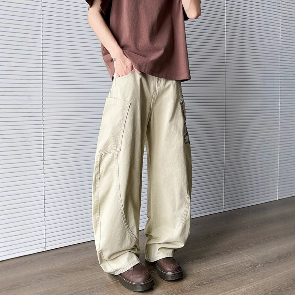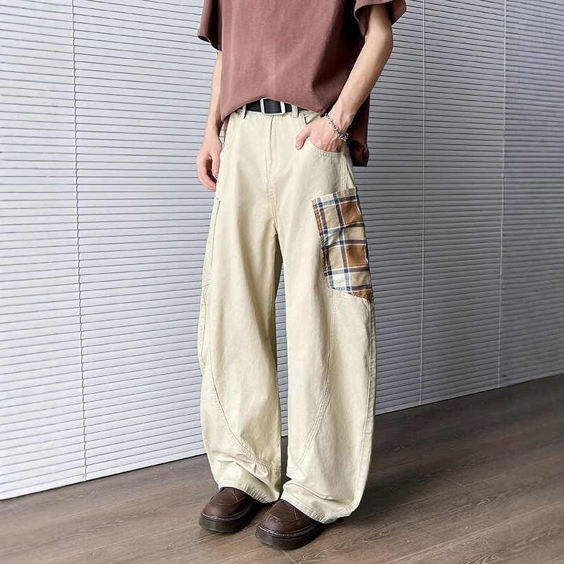 격자 무늬 포켓 스티칭 Machete 크레인 바지 남자 2025 년 여름 새로운 유행 브랜드 Ruffian Handsome 느슨한 직선 바지