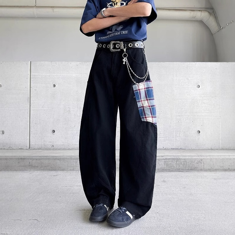 격자 무늬 포켓 스티칭 Machete 크레인 바지 남자 2025 년 여름 새로운 유행 브랜드 Ruffian Handsome 느슨한 직선 바지스토어 가기