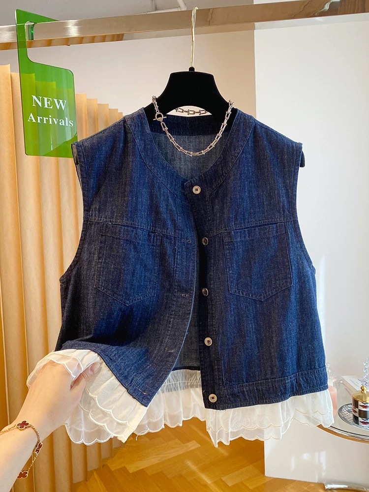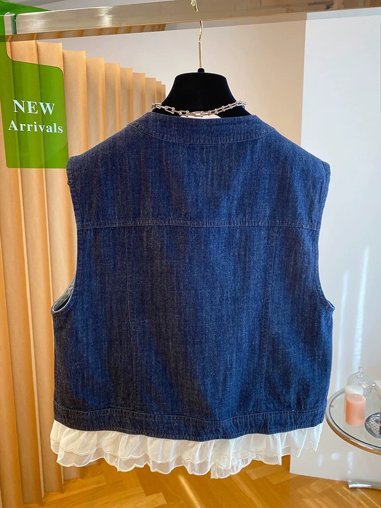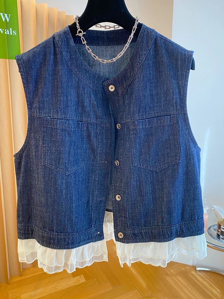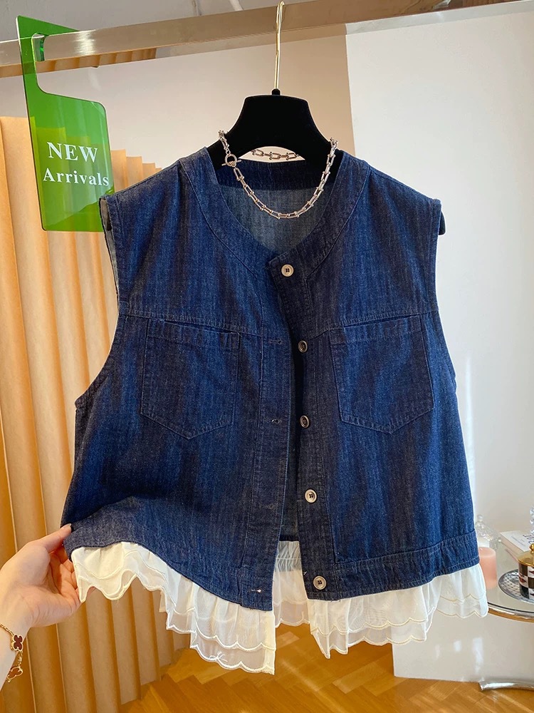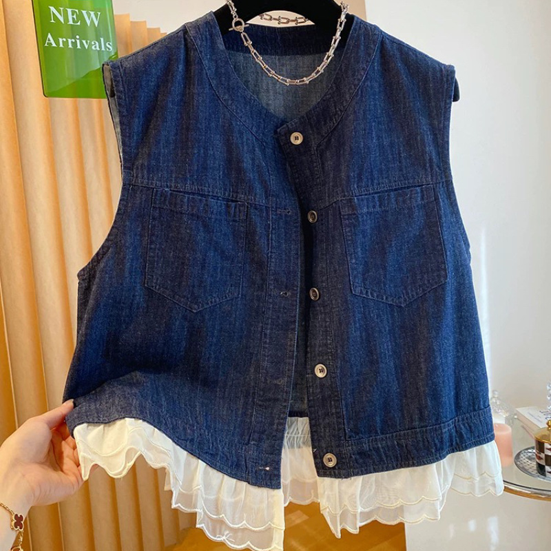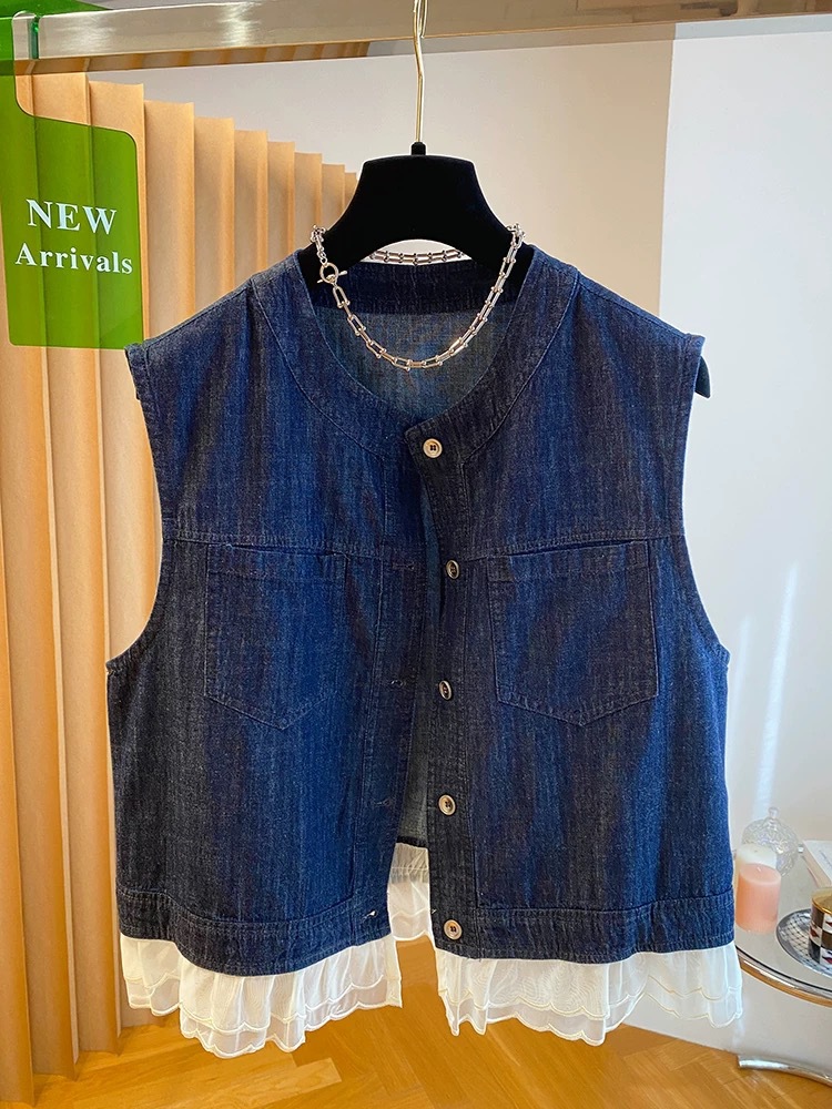 한국 2025 년 여름 새로운 도착 Hem Ear Mesh 바느질 면봉 민소매 재킷 여자 데님 조끼스토어 가기