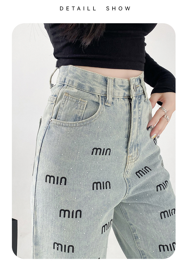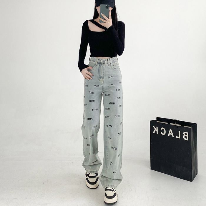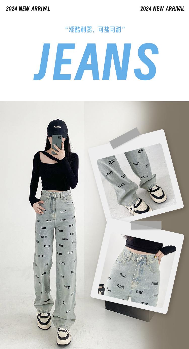 重工烫钻直筒牛仔裤女2024年春秋新款设计感印花高腰阔腿拖地长裤스토어 가기