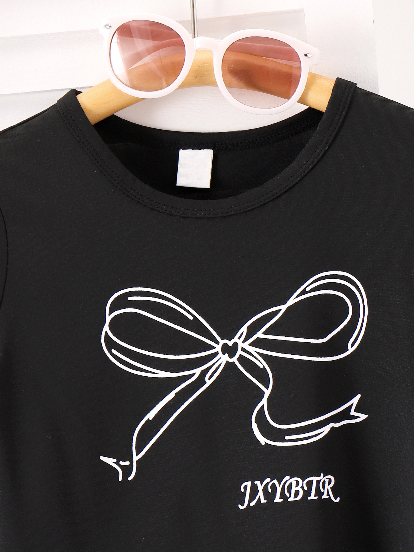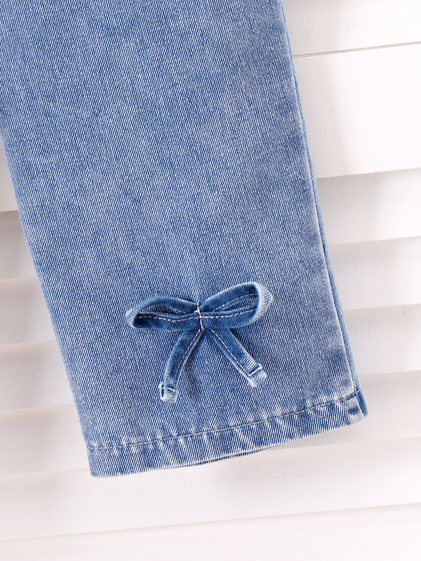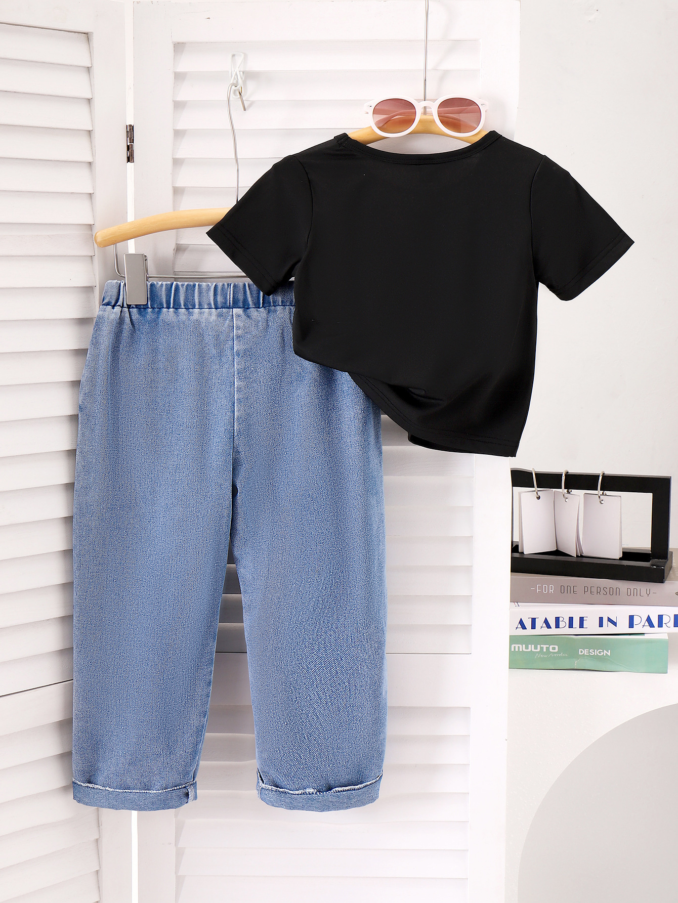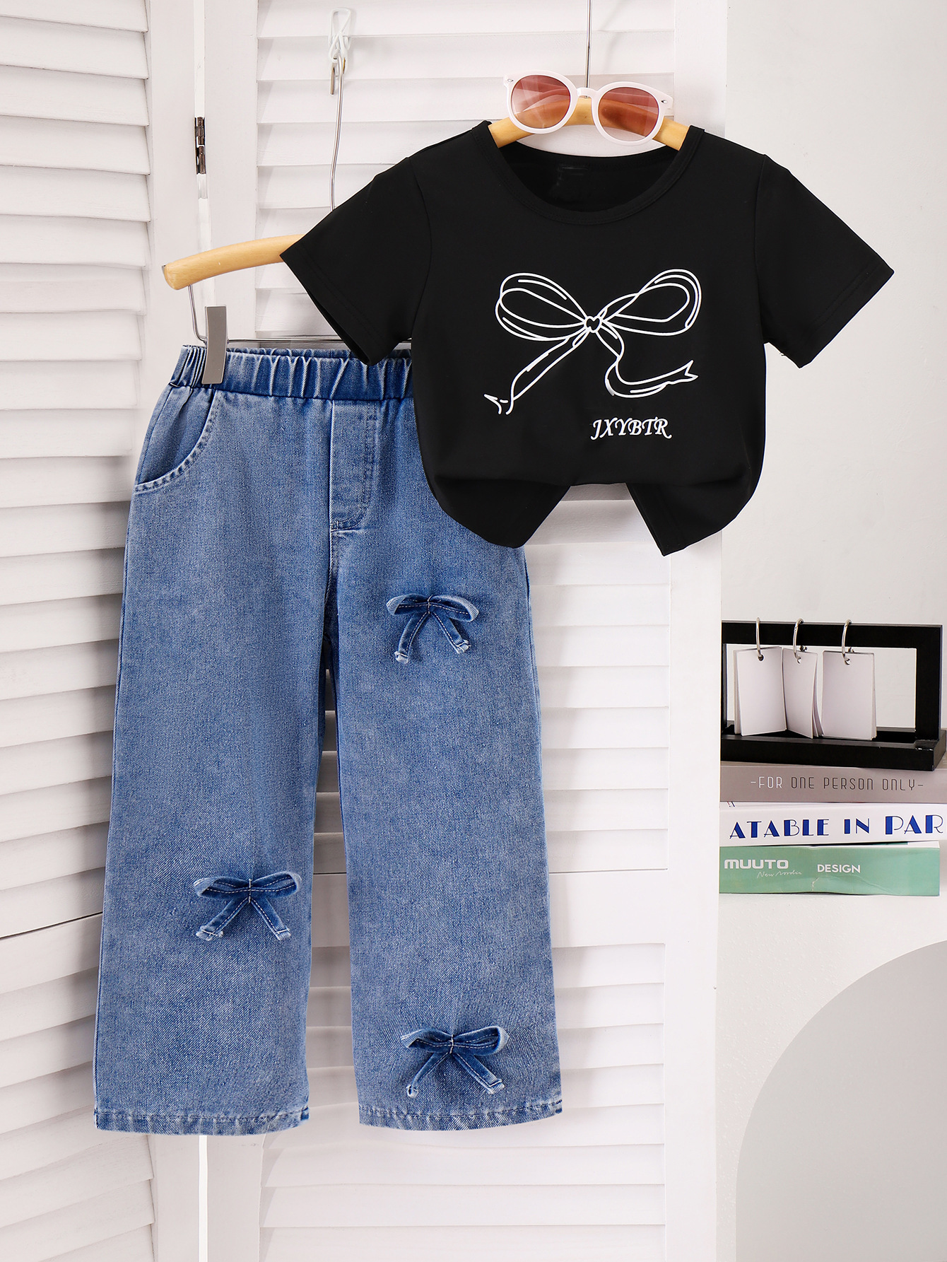 아마존 국경 유럽 및 미국 소녀 여름 새로운 니트 활 인쇄 티셔츠 워시 워터 데님 바지 세트