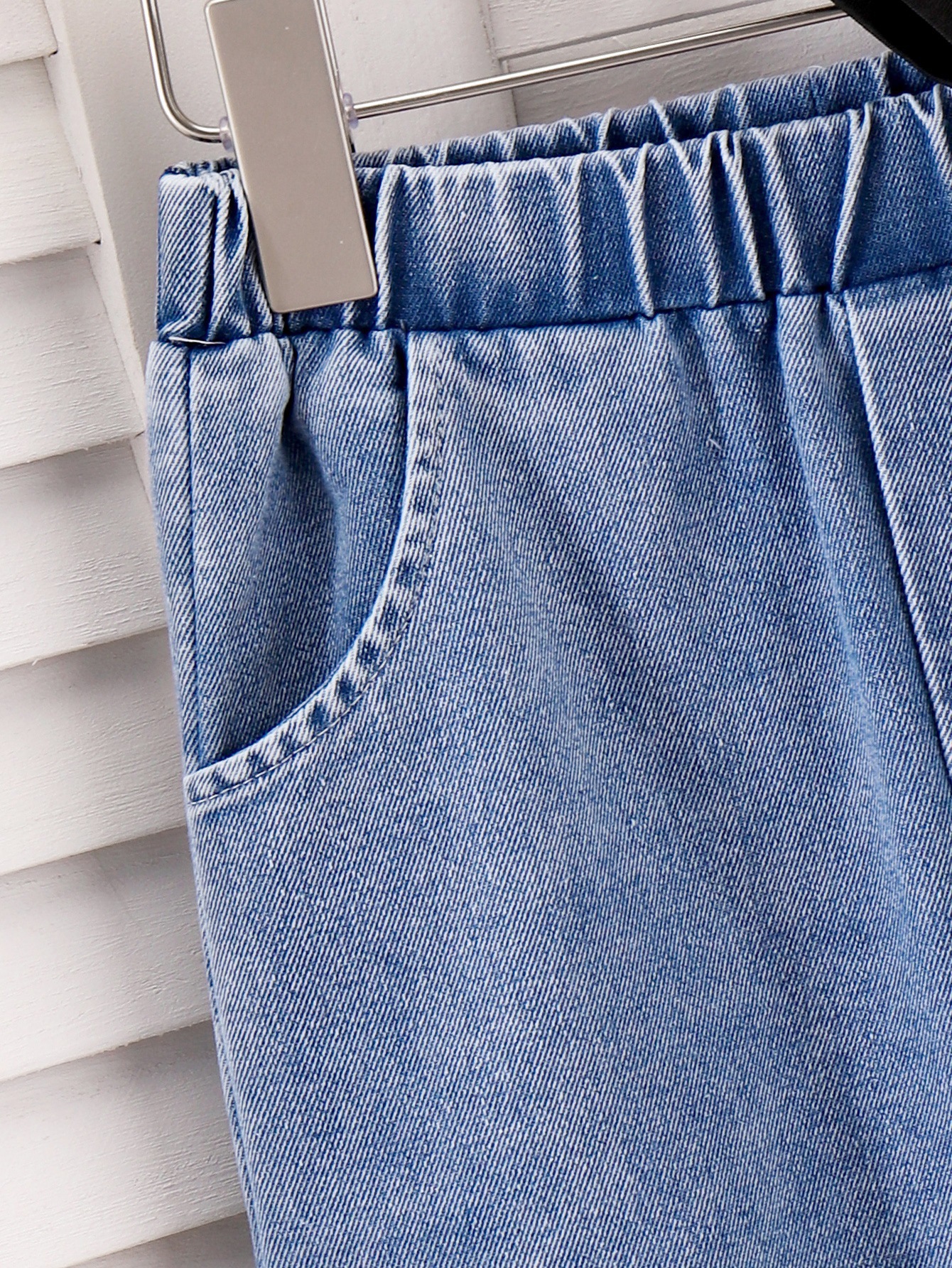 아마존 국경 유럽 및 미국 소녀 여름 새로운 니트 활 인쇄 티셔츠 워시 워터 데님 바지 세트스토어 가기