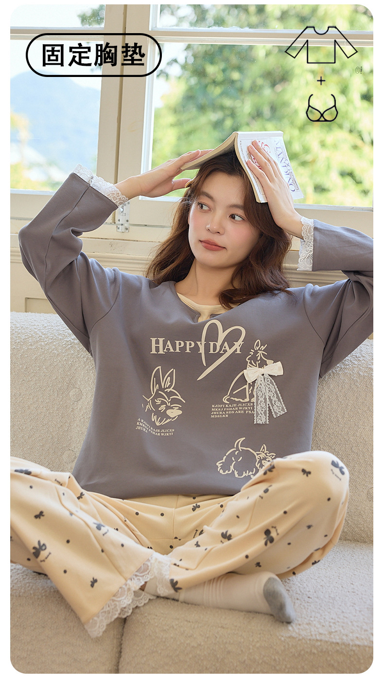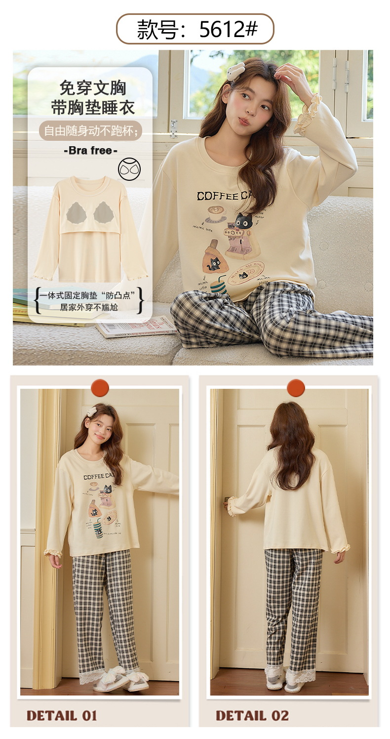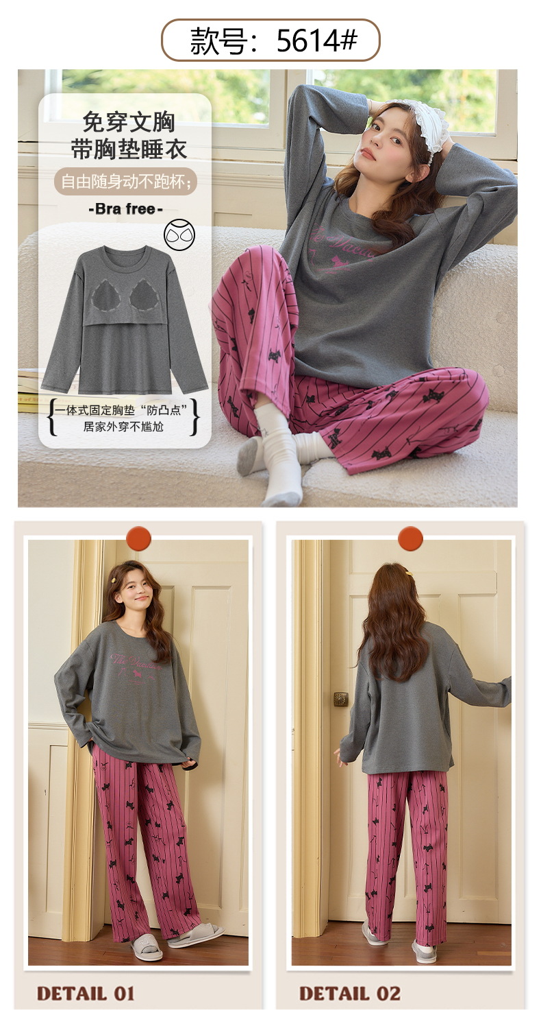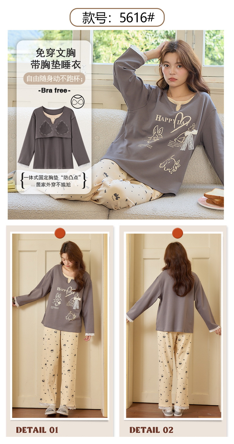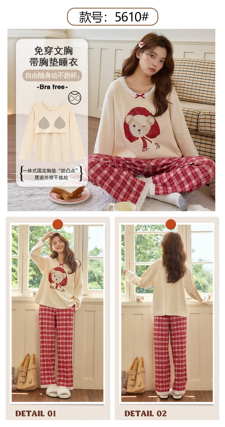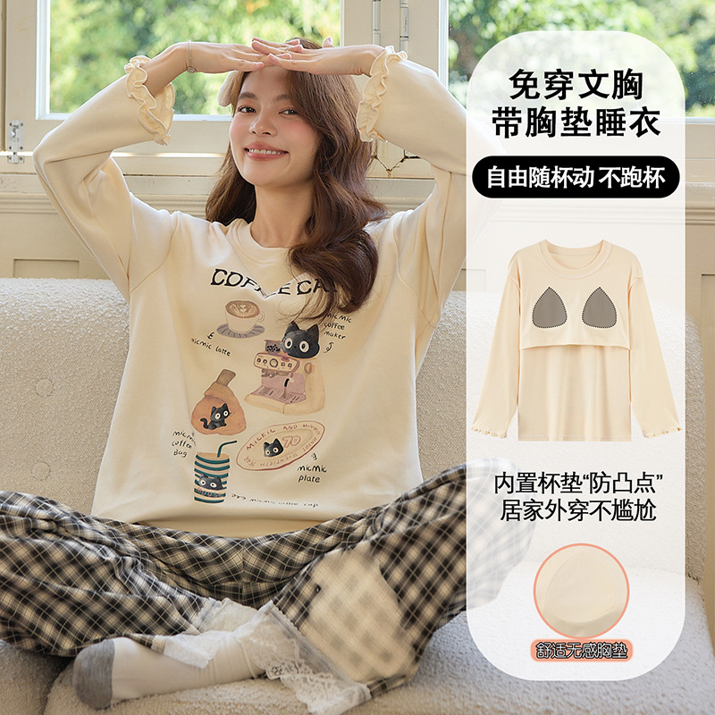 가슴 패드가 있는 여성용 잠옷 2025 가을 겨울 코마사 면 긴팔 바지 세트 만화 귀여운 캐주얼 홈웨어스토어 가기