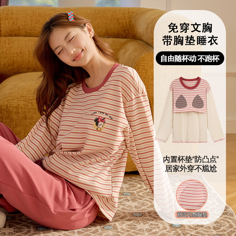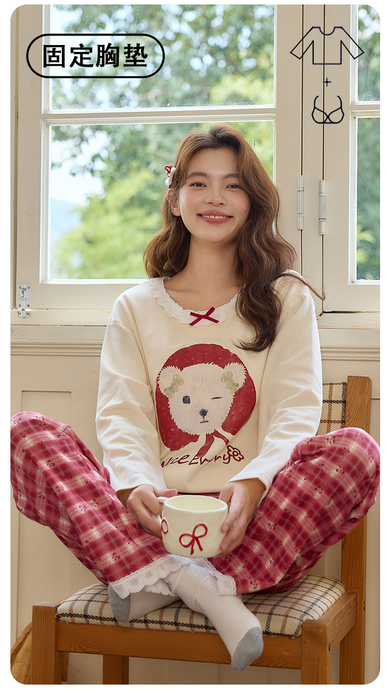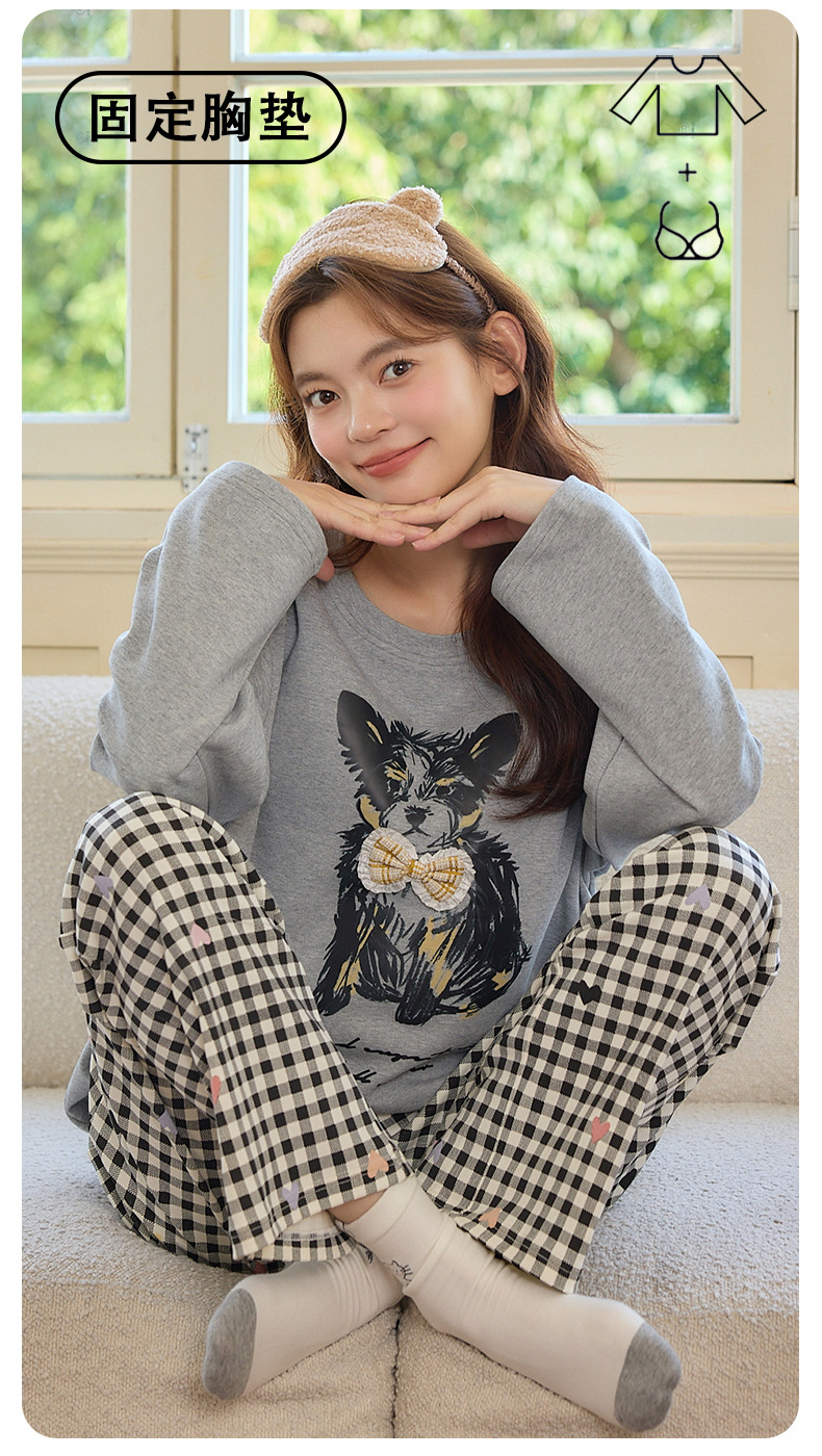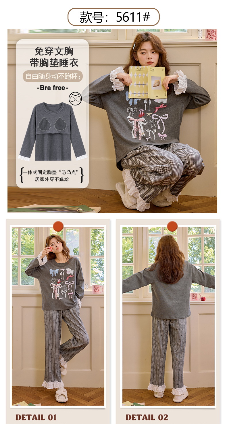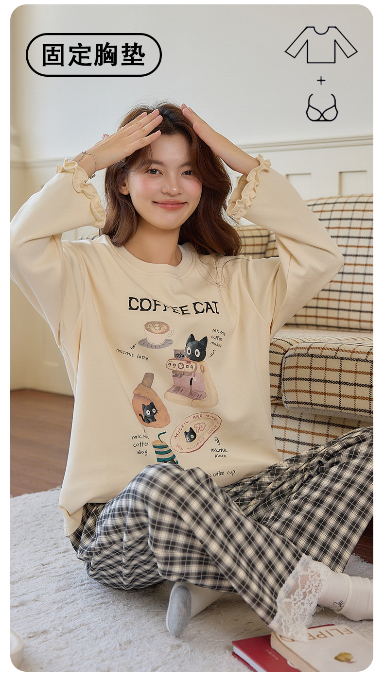 가슴 패드가 있는 여성용 잠옷 2025 가을 겨울 코마사 면 긴팔 바지 세트 만화 귀여운 캐주얼 홈웨어스토어 가기