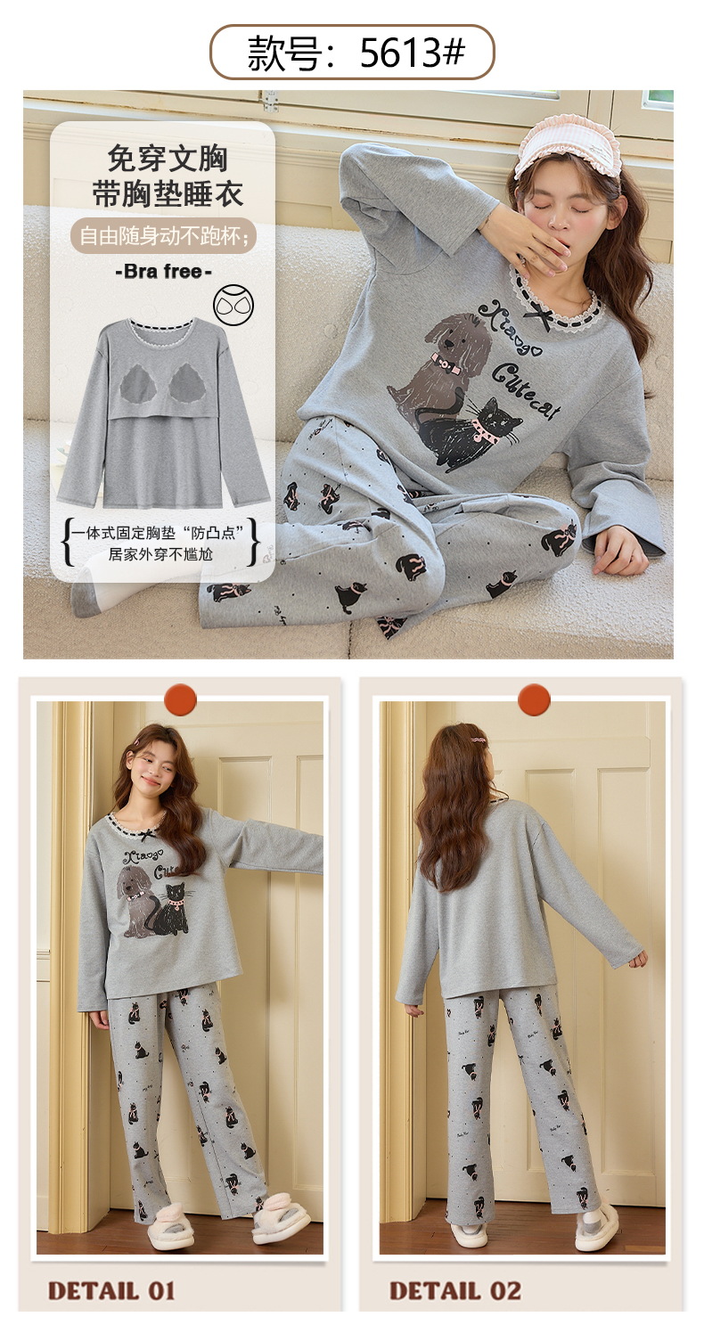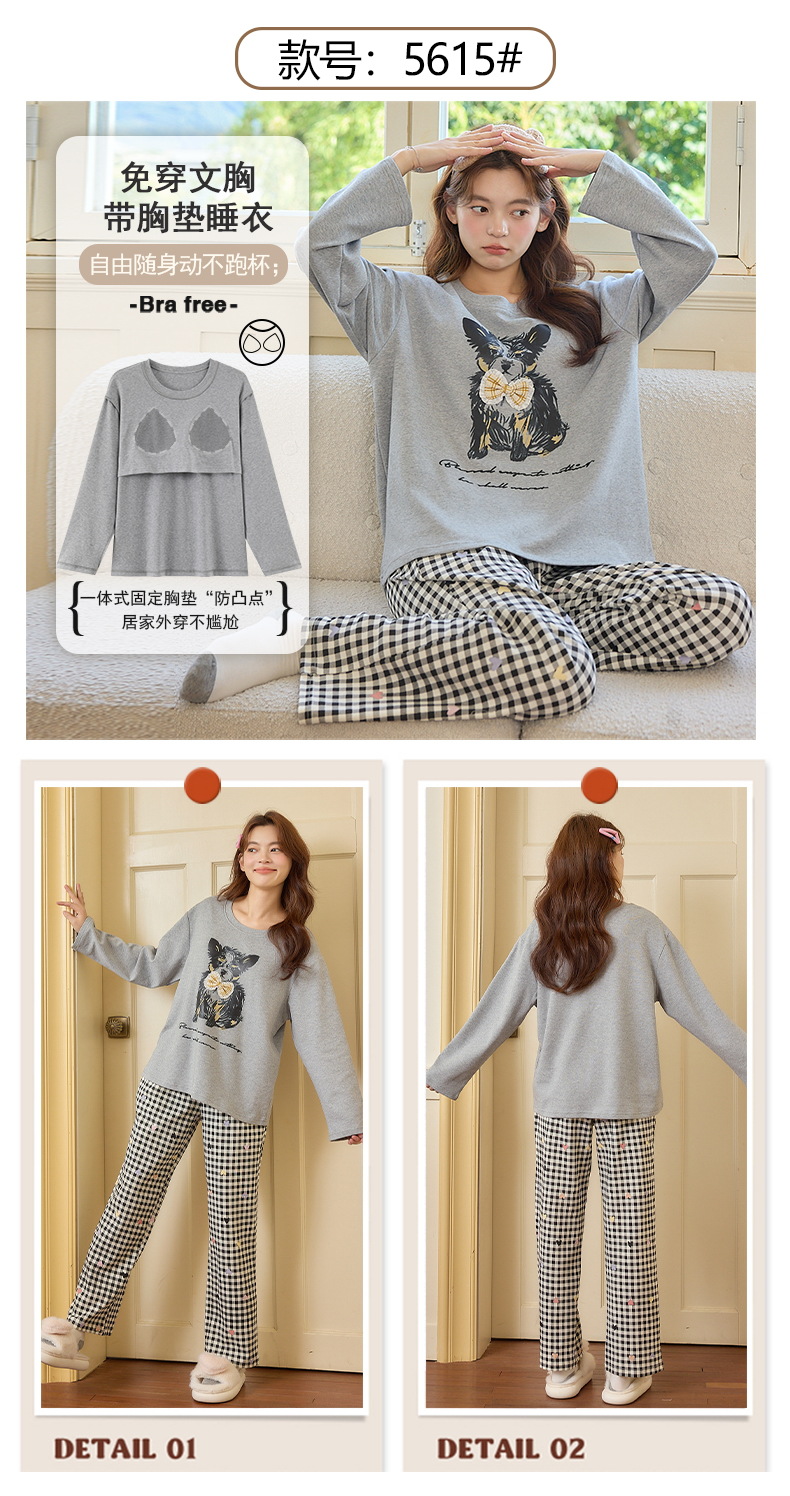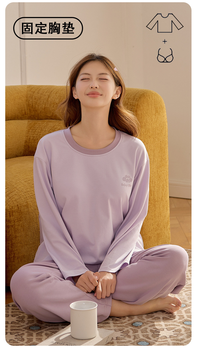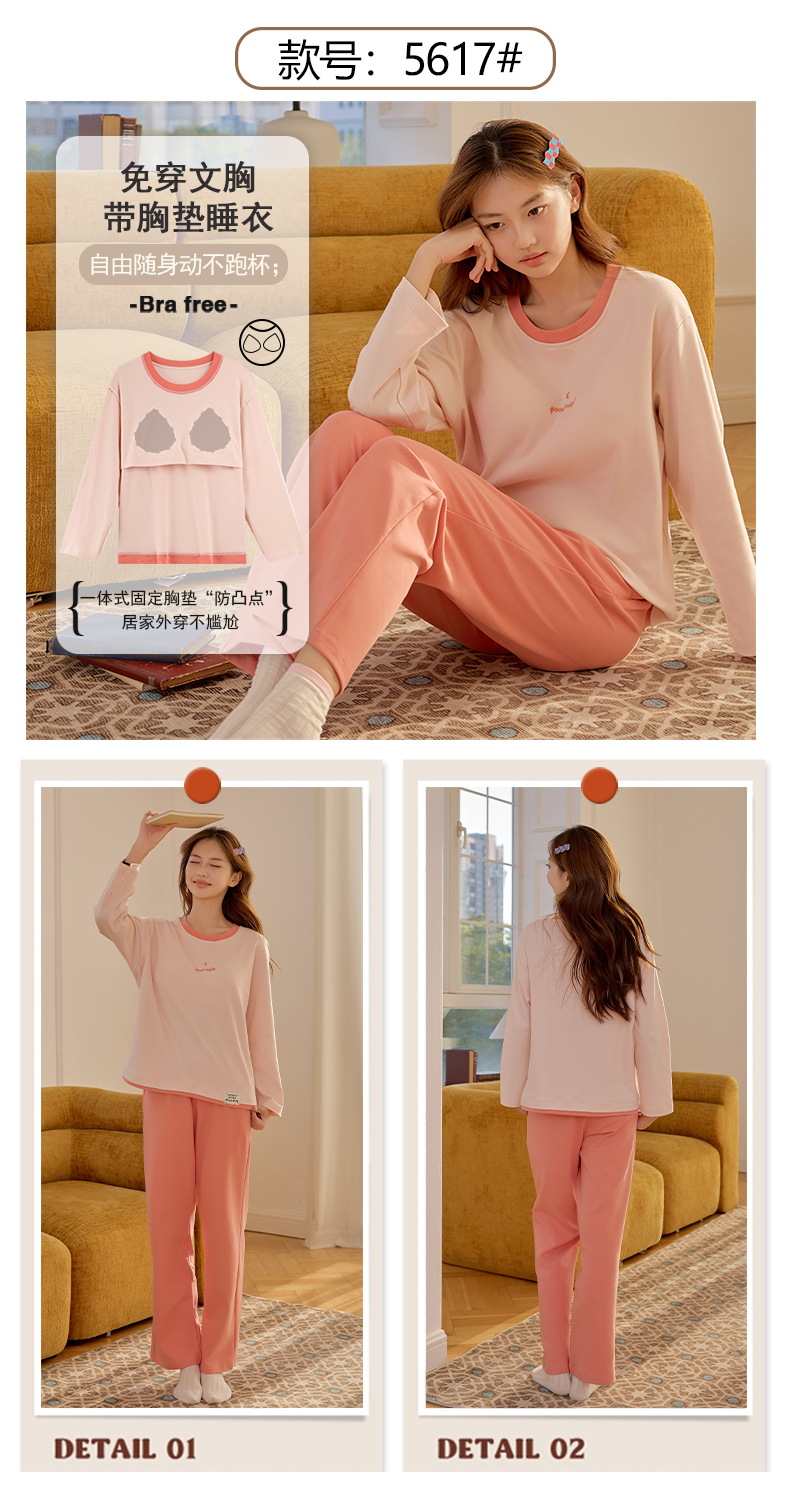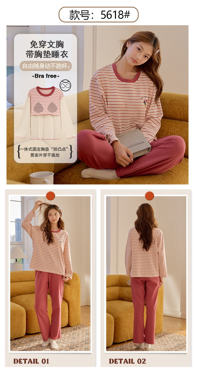 가슴 패드가 있는 여성용 잠옷 2025 가을 겨울 코마사 면 긴팔 바지 세트 만화 귀여운 캐주얼 홈웨어스토어 가기