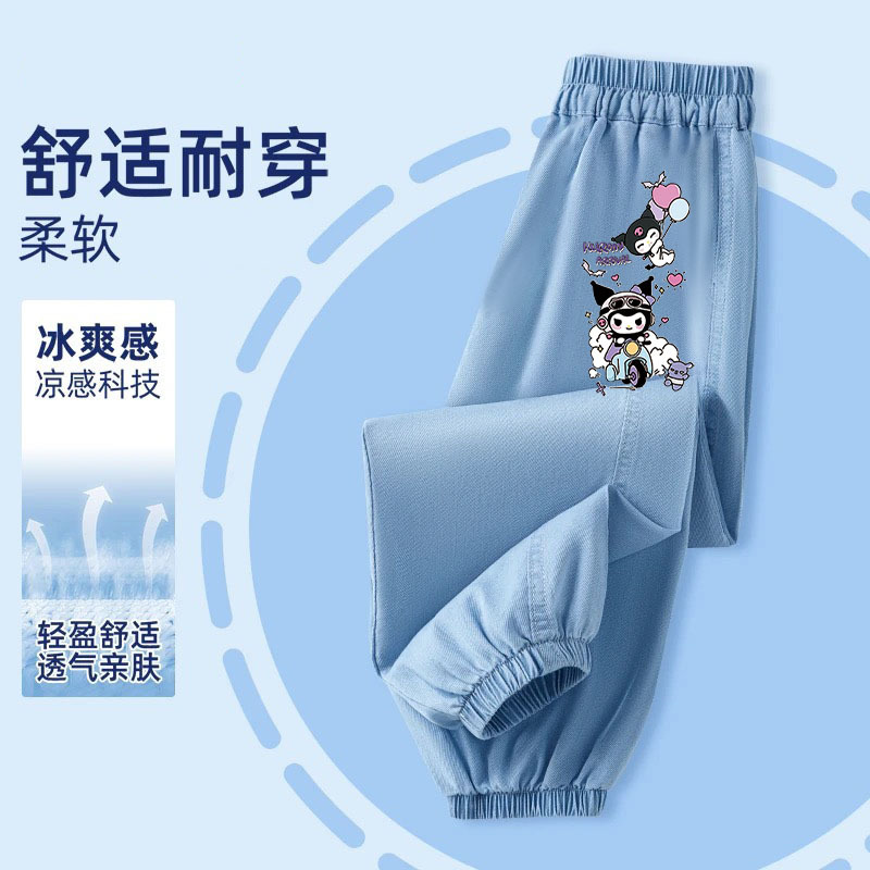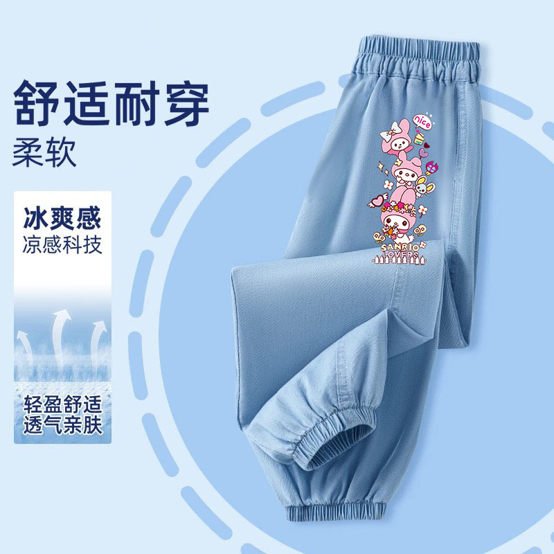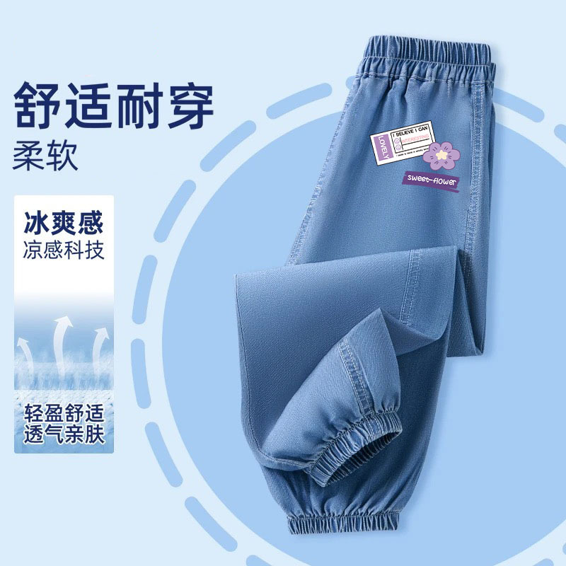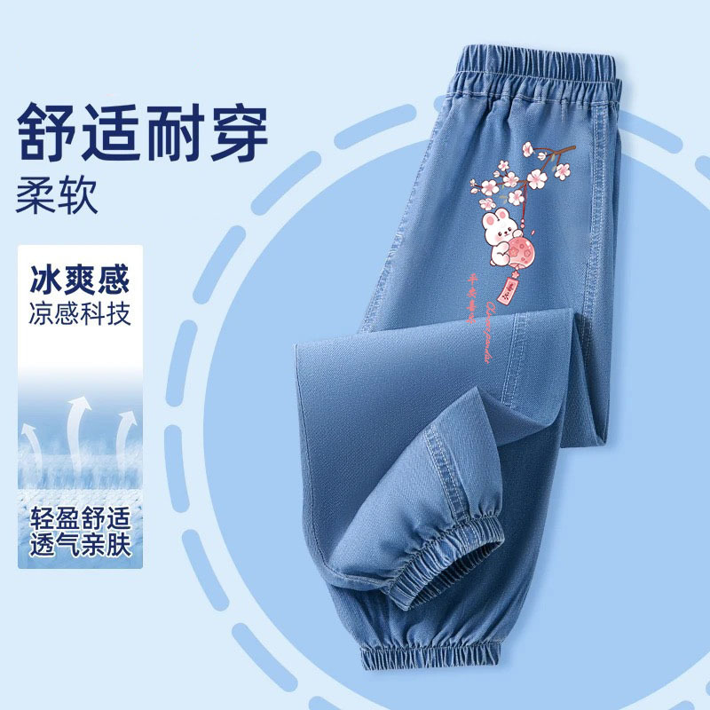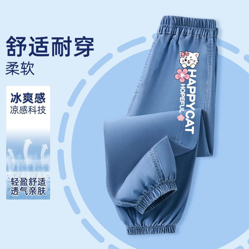 어린이 모기 방지 바지 여름 얇은 얼음 실크 데님 소녀 바지 2025 새로운 만화 다목적 소녀 바지 유행