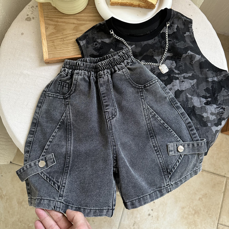 소년 작업복 데님 반바지 여름 얇은 2025 새로운 어린이 데님 바지 소년 5부 바지 스트리트 패션