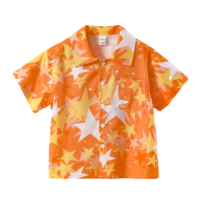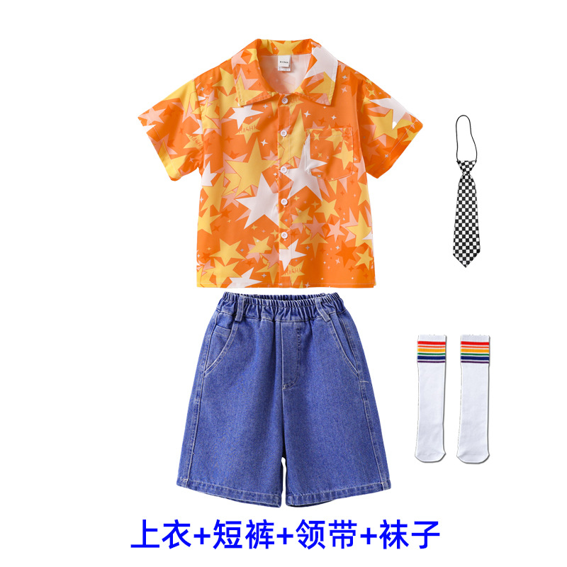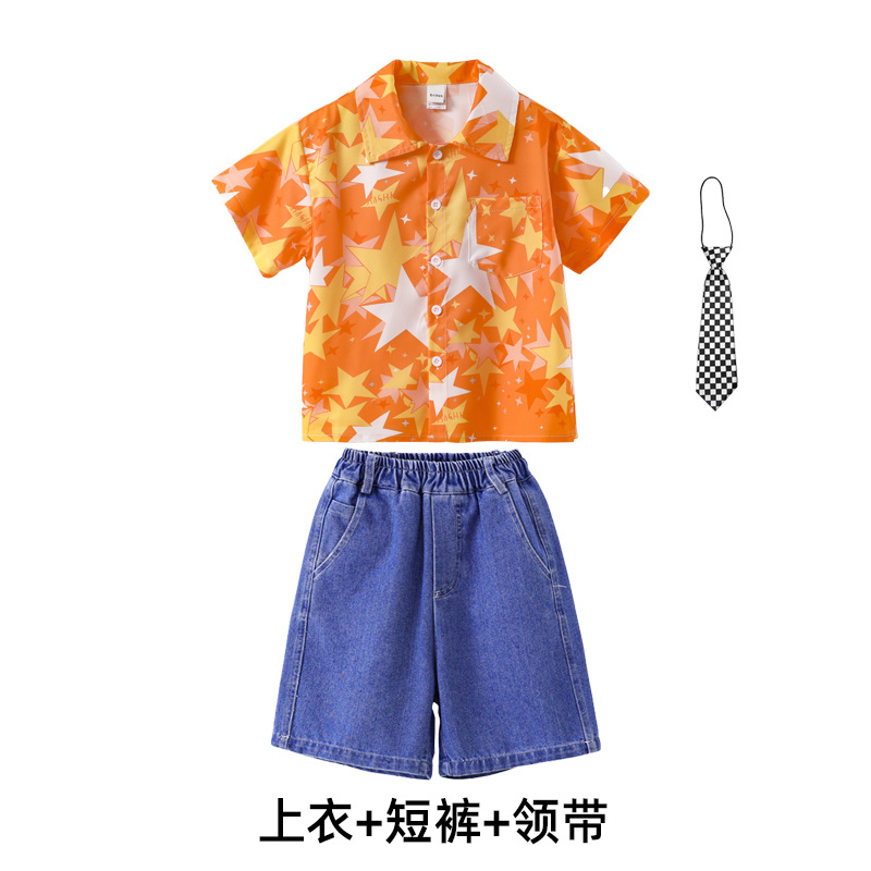 • 153B 오렌지 오각별 반팔 + 141 데님 반바지 (체크무늬 넥타이 포함)