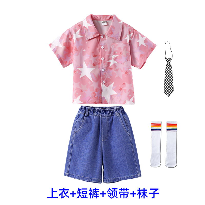 • 153B 핑크 오각별 반팔 + 141 데님 반바지 (체크무늬 넥타이 + 레인보우 양말 포함)