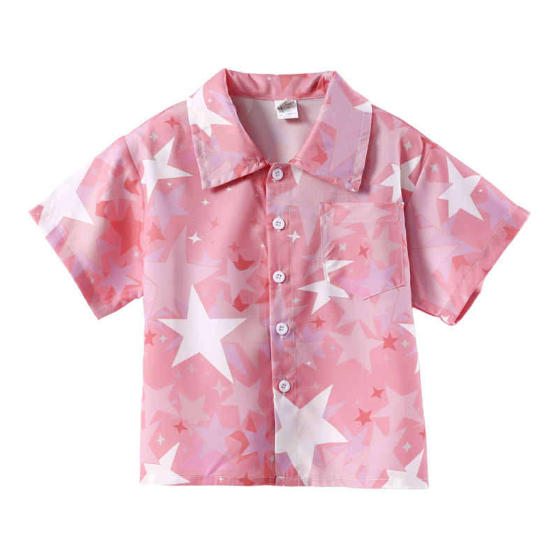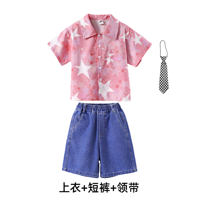 • 153B 핑크 오각별 반팔 + 141 데님 반바지 (체크무늬 넥타이 포함)