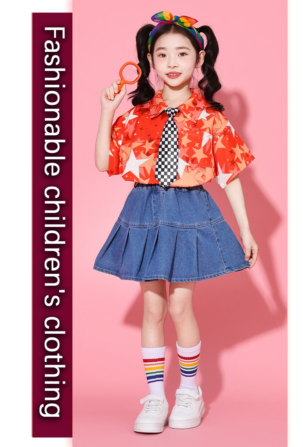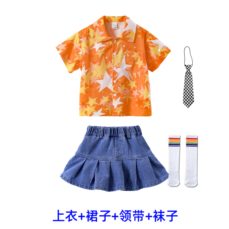 • 153B 오렌지 오각별 반팔 + 160 데님 스커트 (체크무늬 넥타이 + 레인보우 양말 포함)