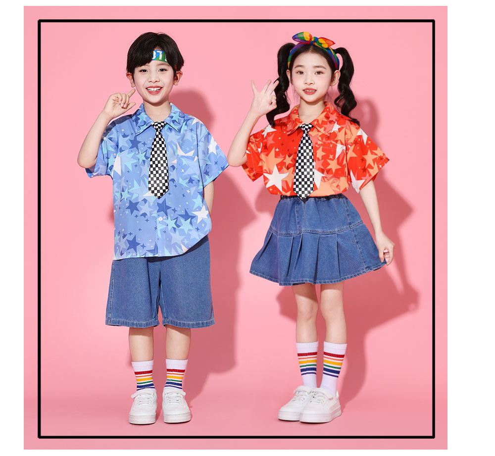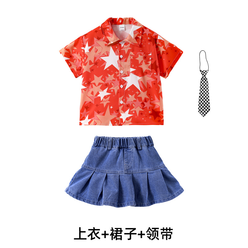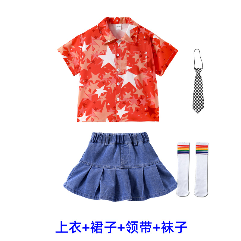 • 153B 파란색 오각별 반팔 + 160 데님 스커트 (무늬 넥타이 + 무지개 양말 포함)