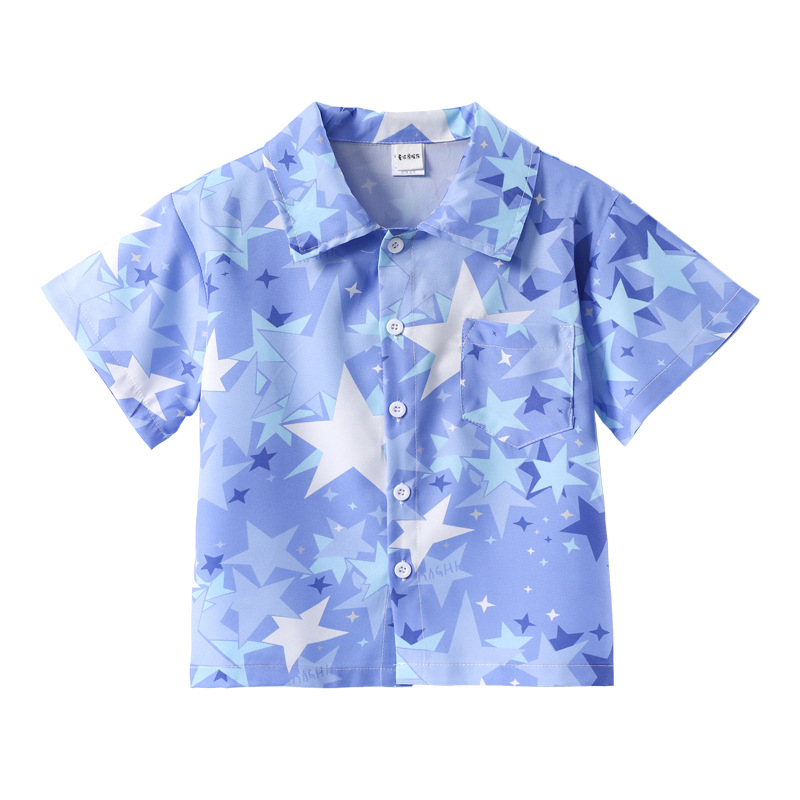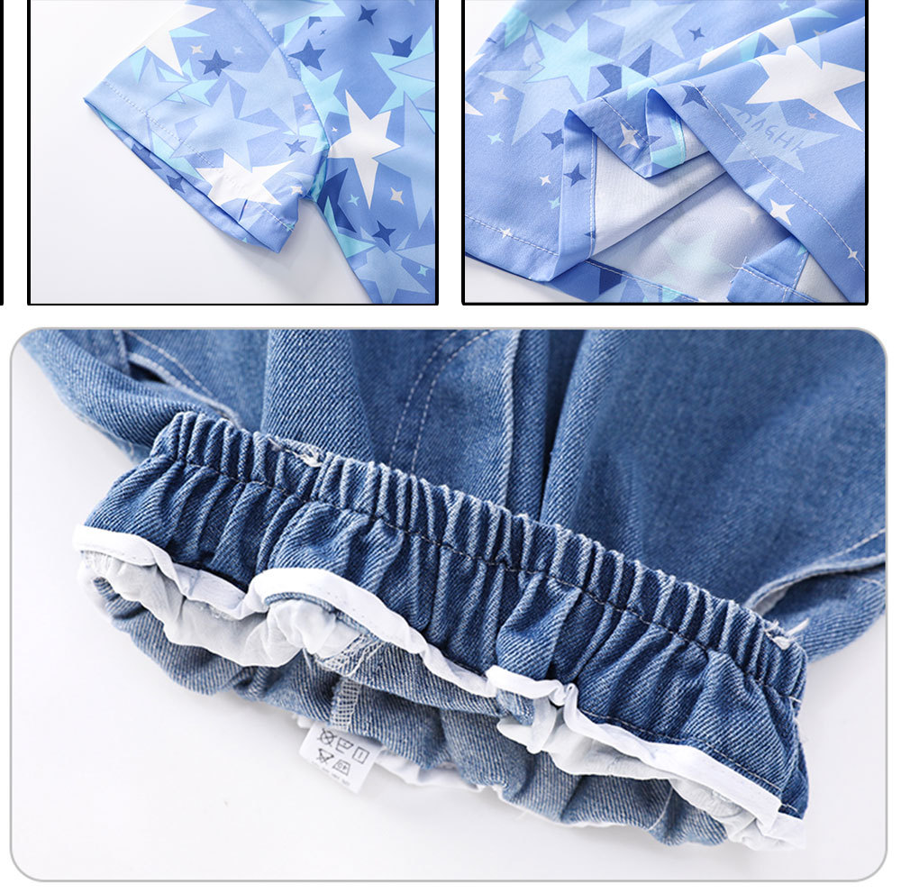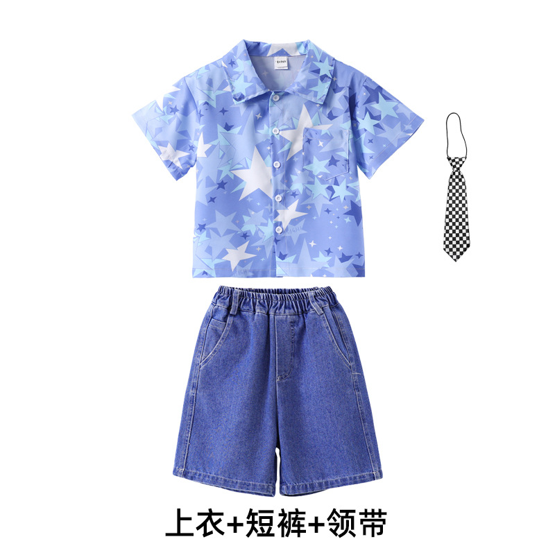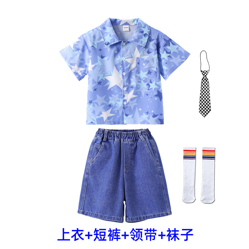 • 153B 파란색 오각별 반팔 + 141 데님 반바지 (무료 체크무늬 넥타이 + 레인보우 양말)