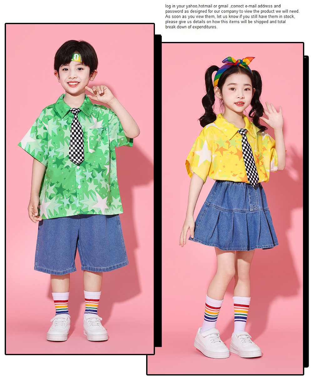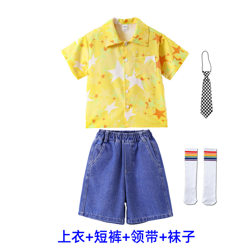 • 153B 노란색 오각별 반팔 + 141 데님 반바지 (무료 체크무늬 넥타이 + 레인보우 양말)