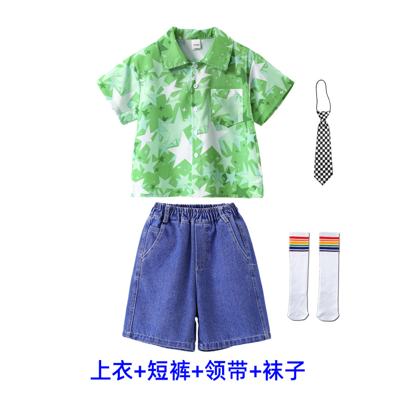 • 153B 녹색 오각별 반팔 + 141 데님 반바지 (무료 체크무늬 넥타이 + 무지개 양말)