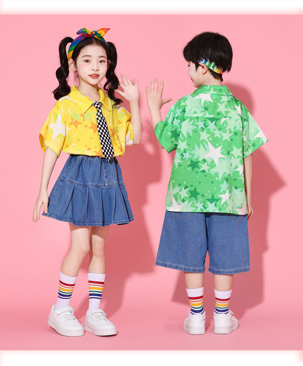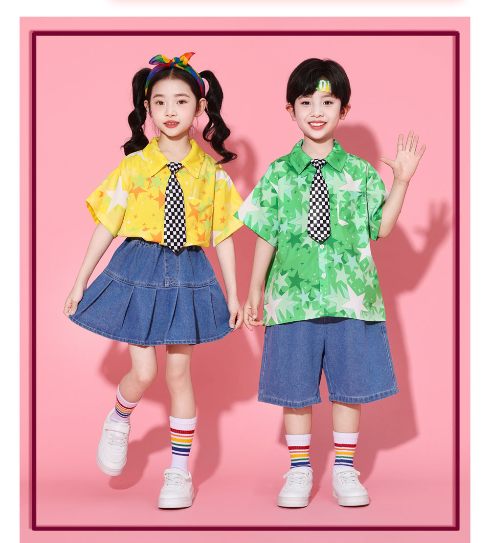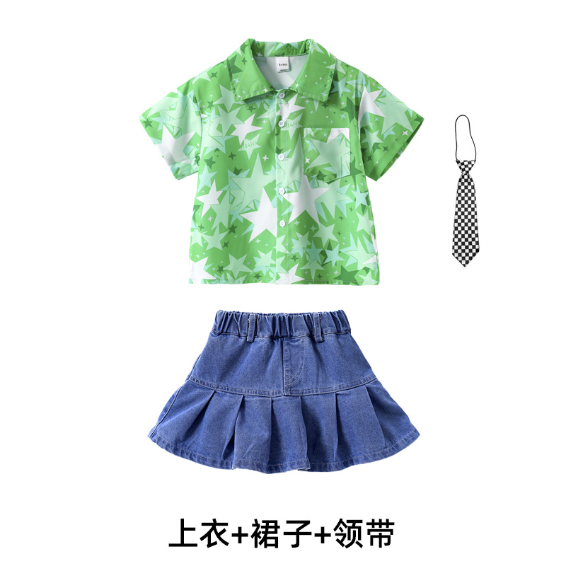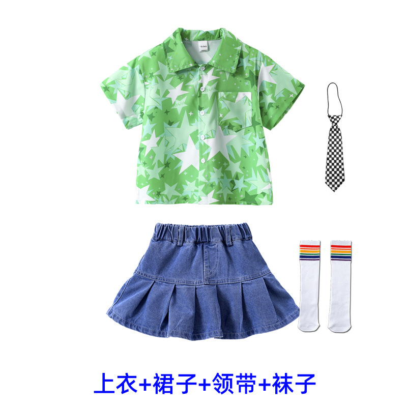 • 153B 녹색 오각별 반팔 + 160 데님 스커트 (무료 체크무늬 넥타이 + 무지개 양말)