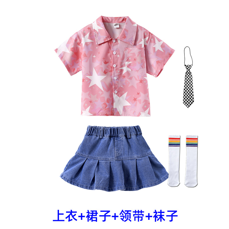 • 153B 핑크 오각별 반팔 + 160 데님 스커트 (체크무늬 넥타이 + 레인보우 양말 포함)