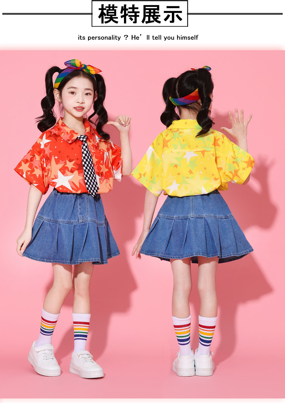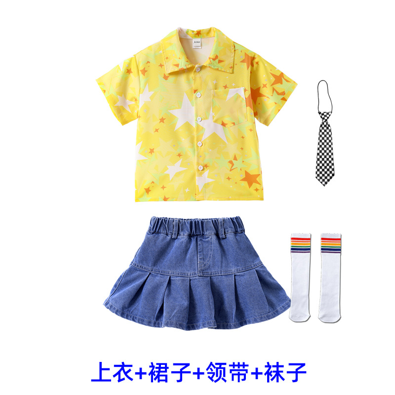 • 153B 노란색 오각별 반팔 + 160 데님 스커트 (체크무늬 넥타이 + 무지개 양말 포함)