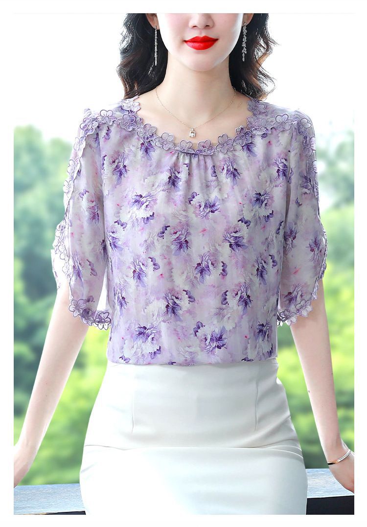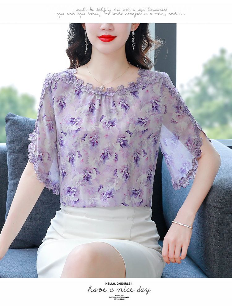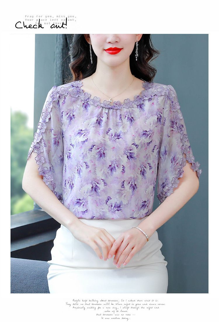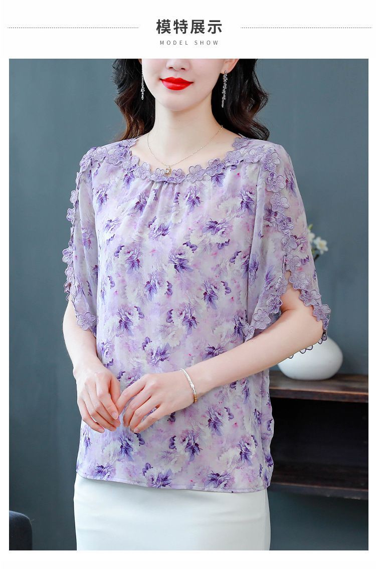 여성을 위한 프린트 디자인 5부 소매 레이스 쉬폰 셔츠 여름 신작 중년 엄마복 배를 커버하고 슬림해 보이는 상의