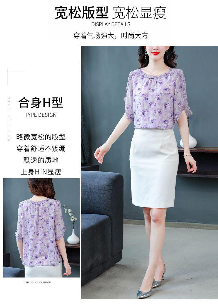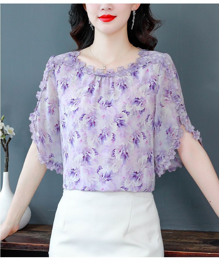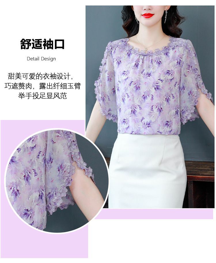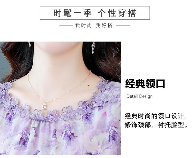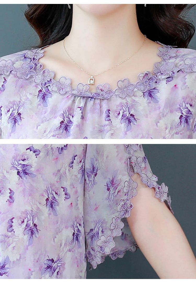 여성을 위한 프린트 디자인 5부 소매 레이스 쉬폰 셔츠 여름 신작 중년 엄마복 배를 커버하고 슬림해 보이는 상의