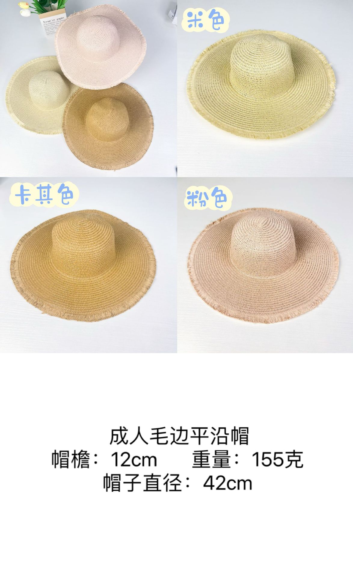 成人毛边平沿帽:帽围57cm左右 帽檐12cm左右 重量约155克 直径42cm左右