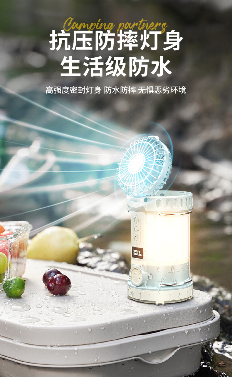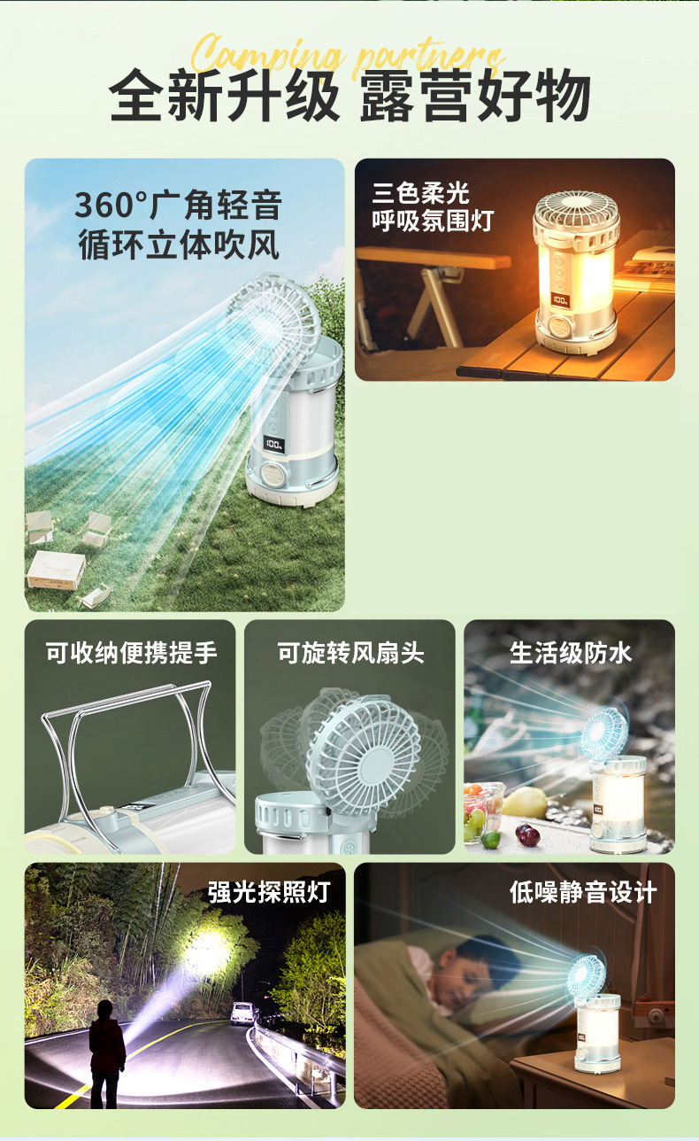 产品卖点:风扇灯+露营灯+探照灯+数字电显