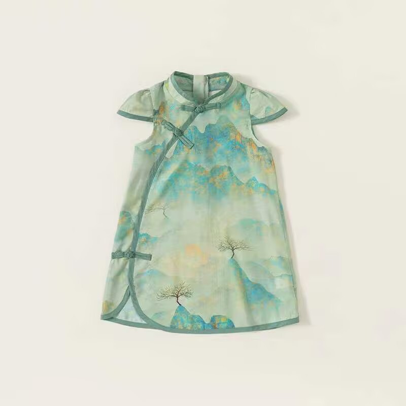 소녀의 국가 스타일 원피스 여름 새 2025 짧은 소매 풍경 인쇄 청삼 원피스 새로운 중국 스타일 소녀의 보물 원피스스토어 가기