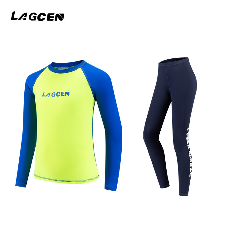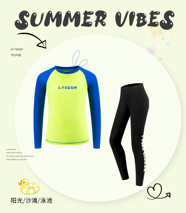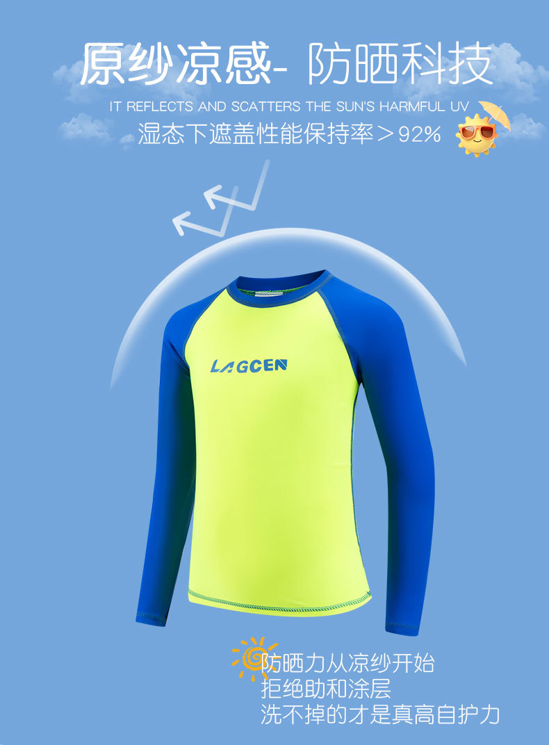 LAGCEN 신제품 대형, 중형 및 소형 어린이 서핑 슈트, 자외선 차단제, 밝은 색상의 수영복, 통기성 잠수복, 대외 무역 제조 업체 도매스토어 가기