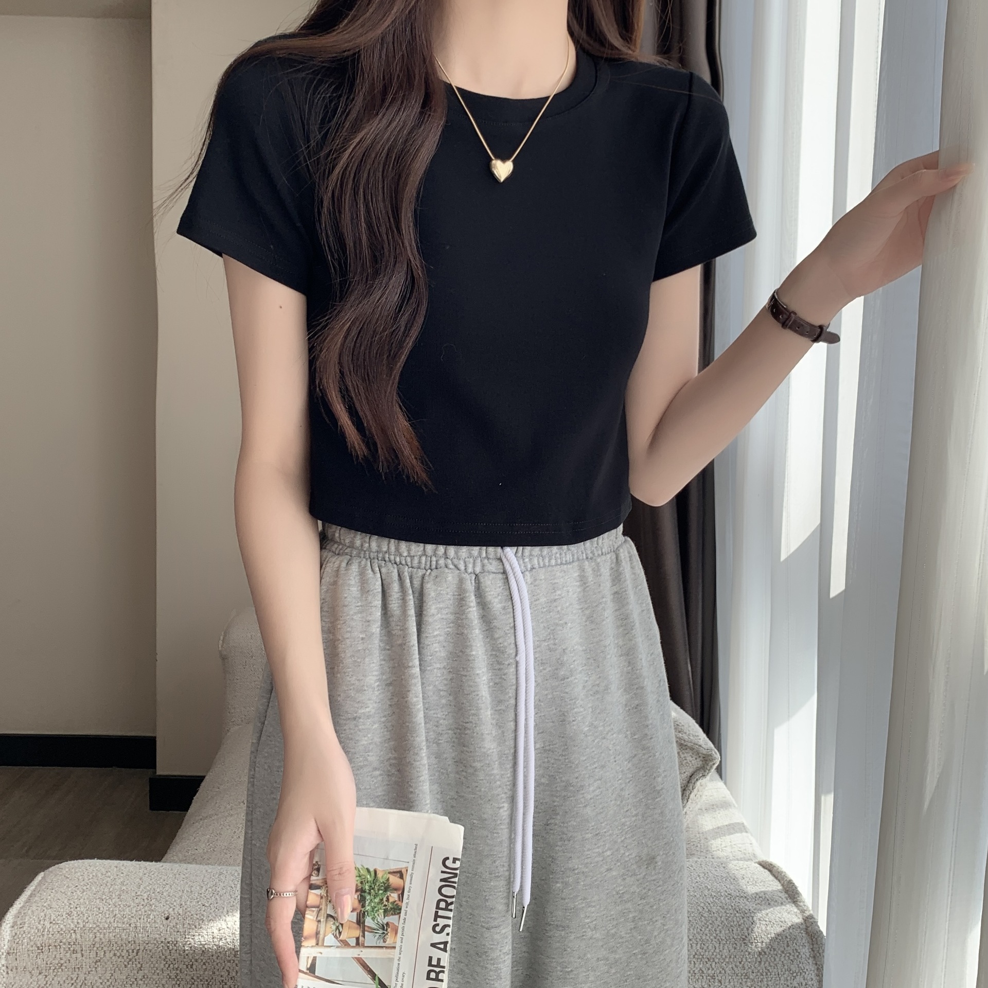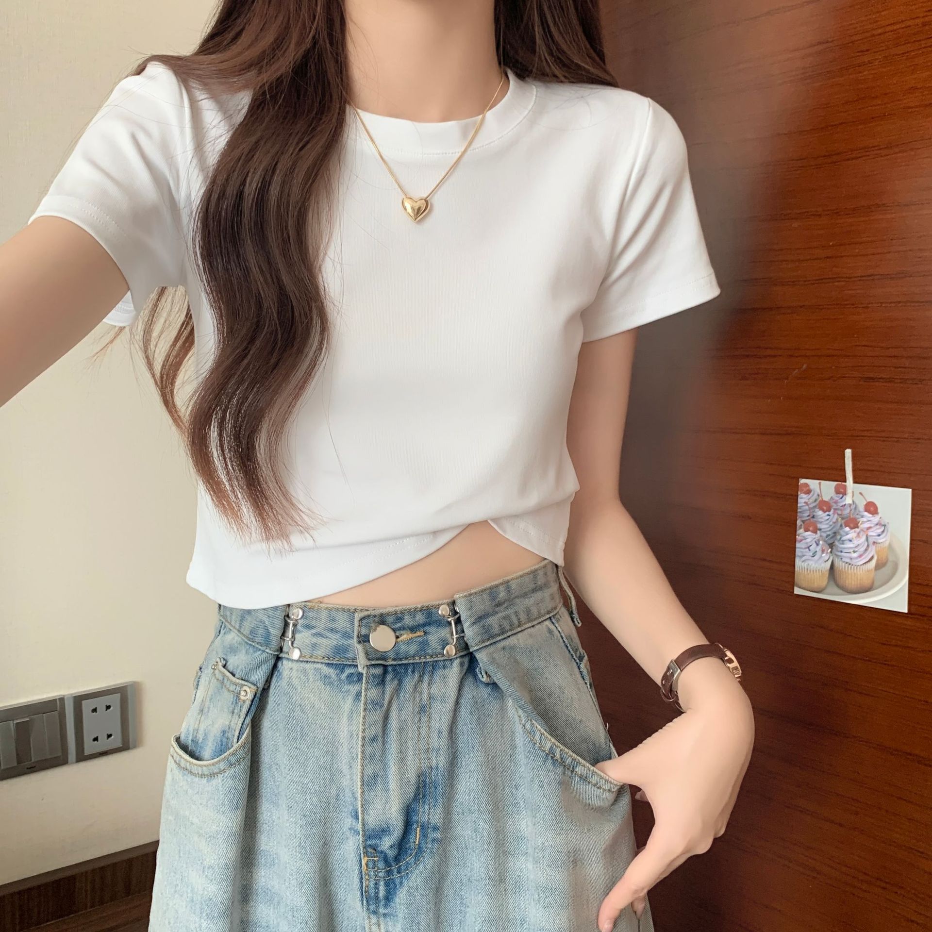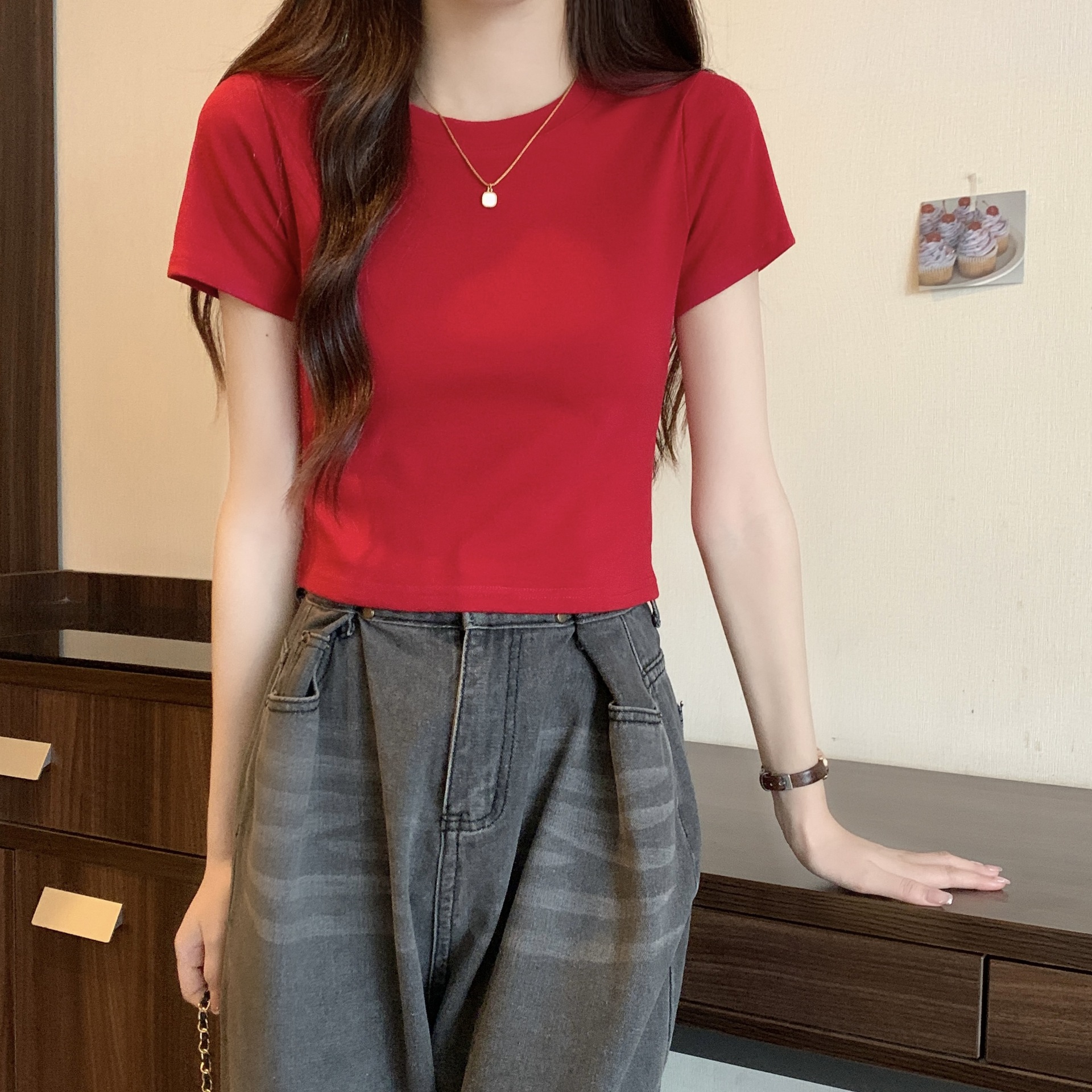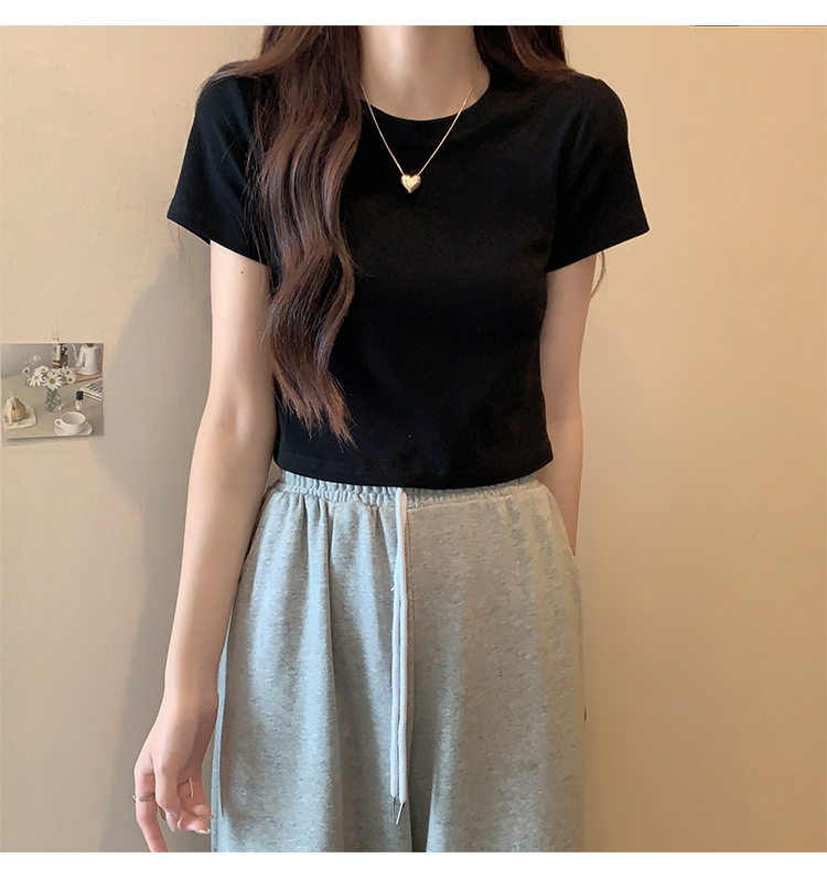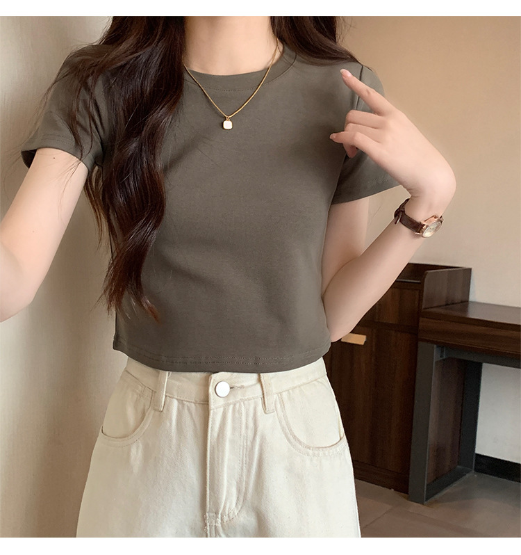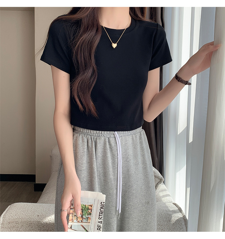 2025 년 여름 여성 반팔 어깨 티셔츠 뉴 라운드 넥 올 매치 타이트탑 하이 웨이스트 배꼽 노출 솔리드 컬러 쇼트 셔츠스토어 가기