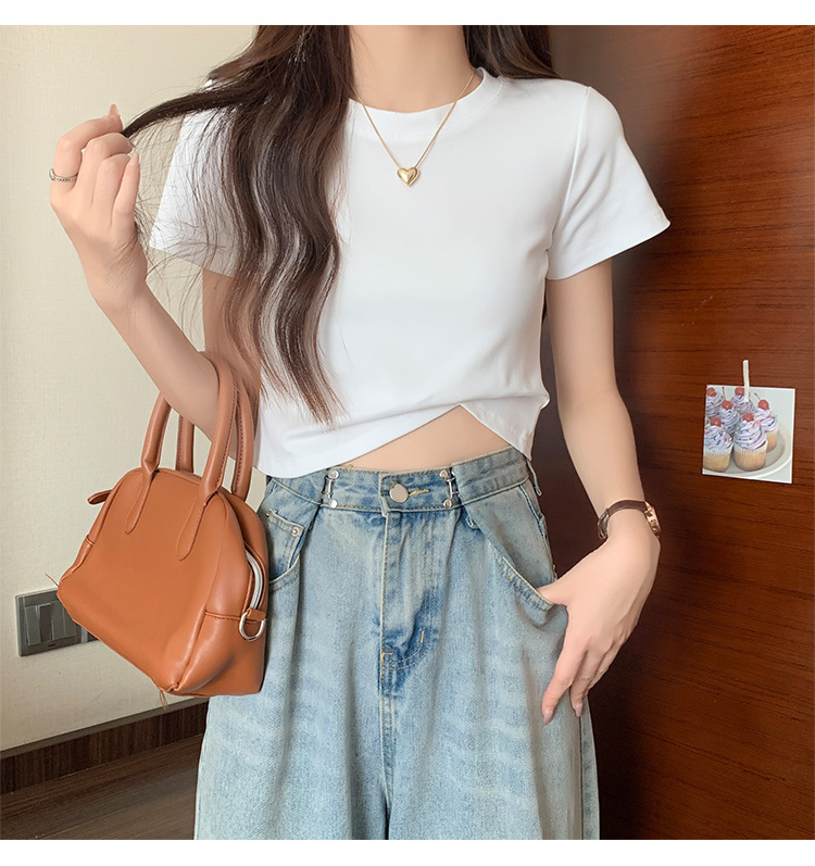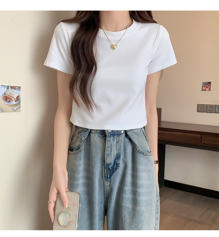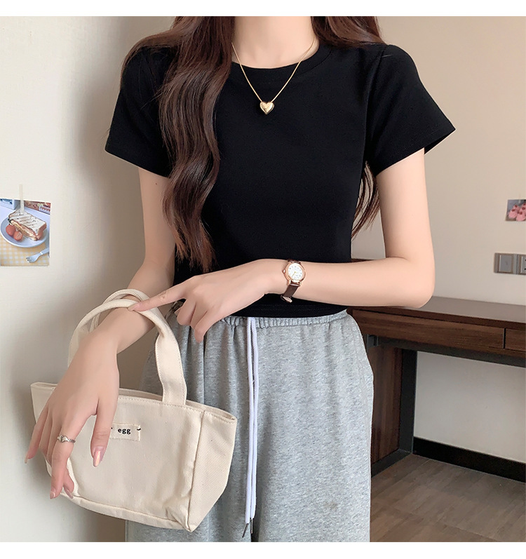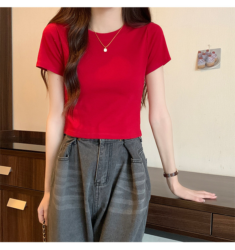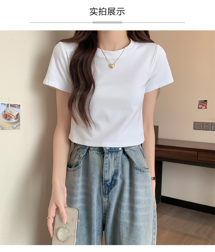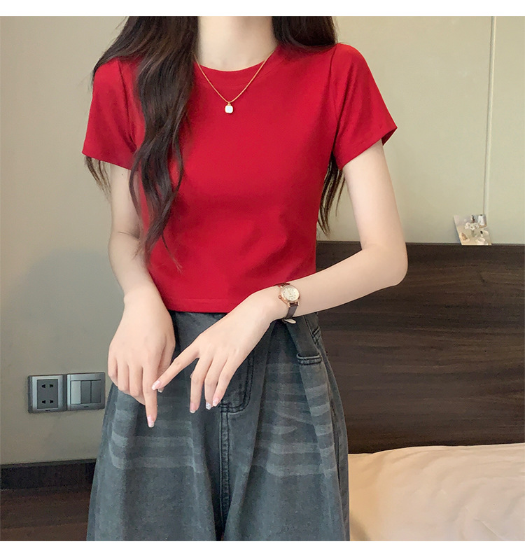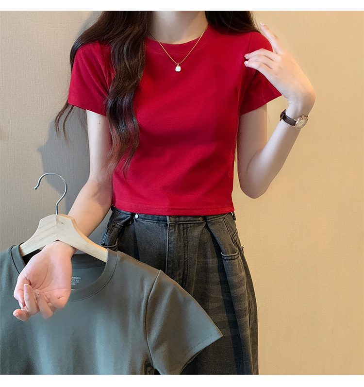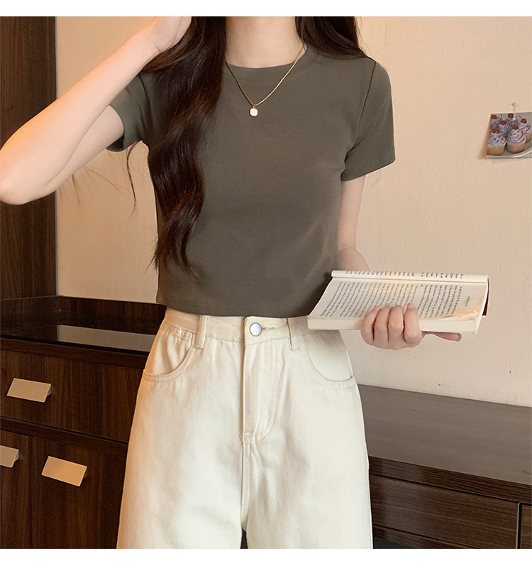 2025 년 여름 여성 반팔 어깨 티셔츠 뉴 라운드 넥 올 매치 타이트탑 하이 웨이스트 배꼽 노출 솔리드 컬러 쇼트 셔츠