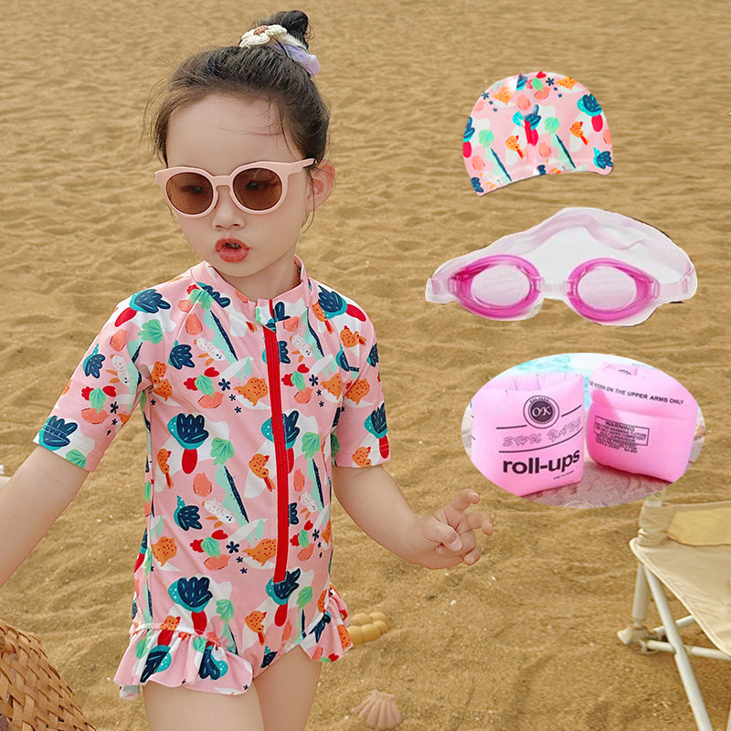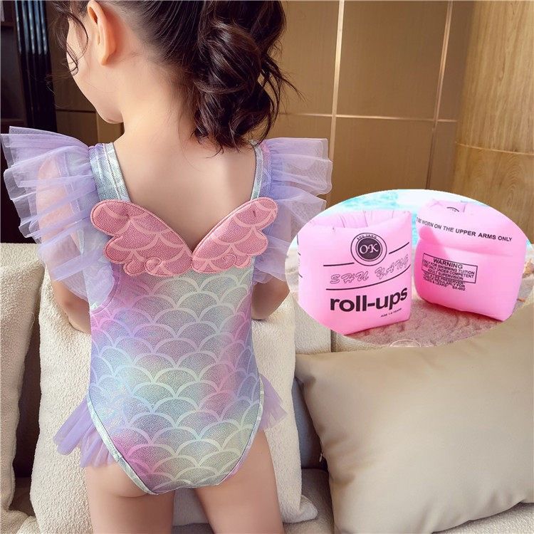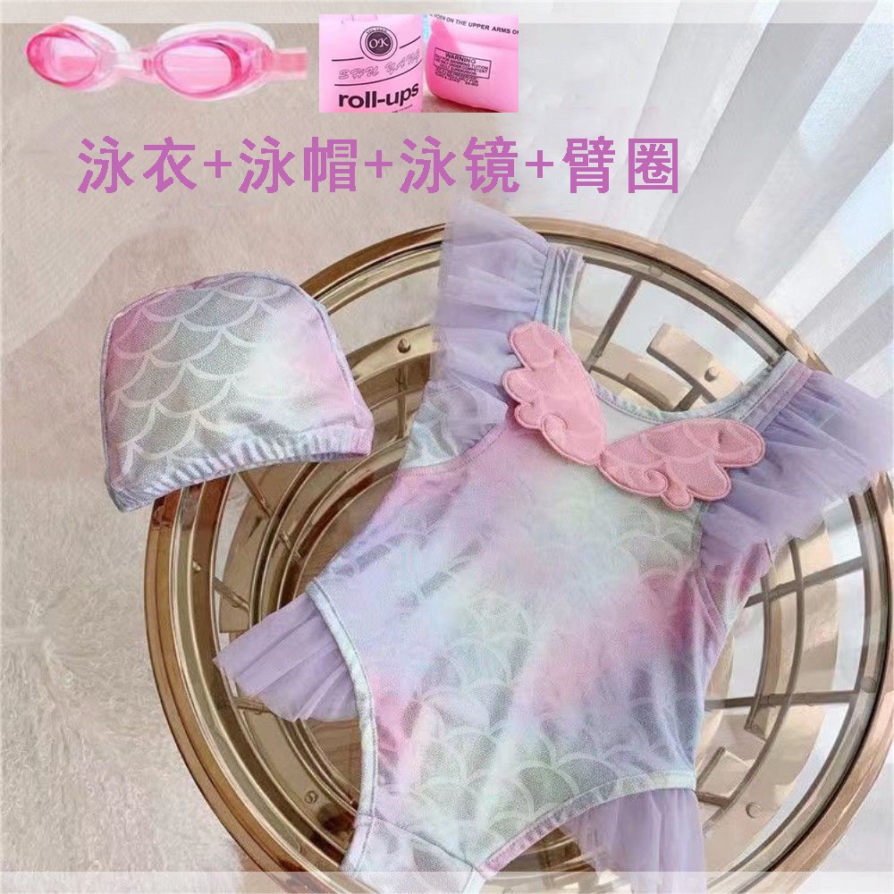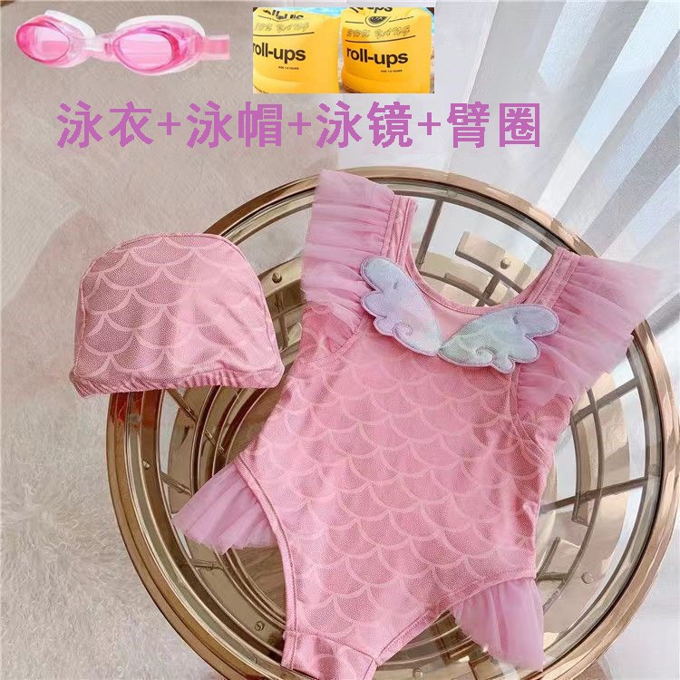 • 핑크 날개 원피스 수영복 + 수영 고글 + 수영 모자 + 팔걸이
