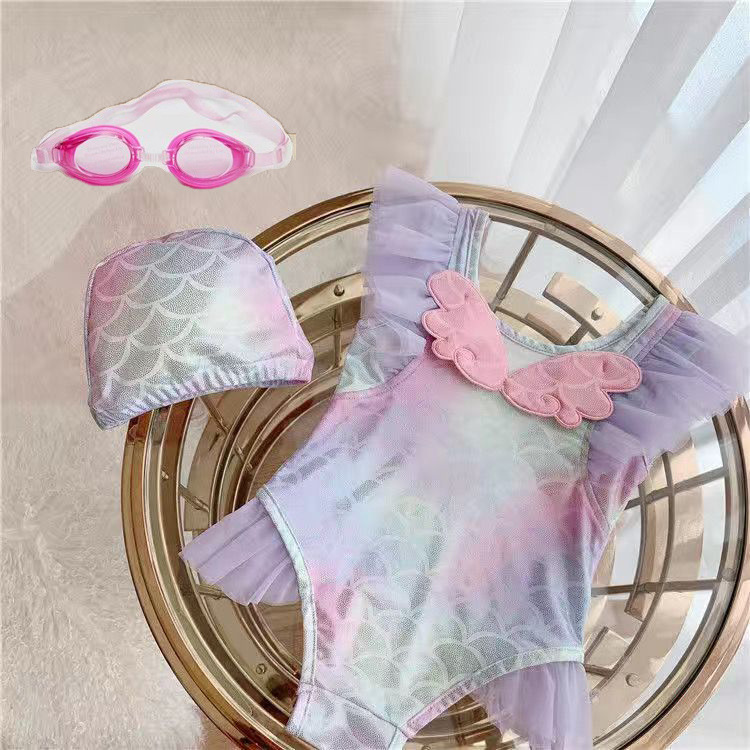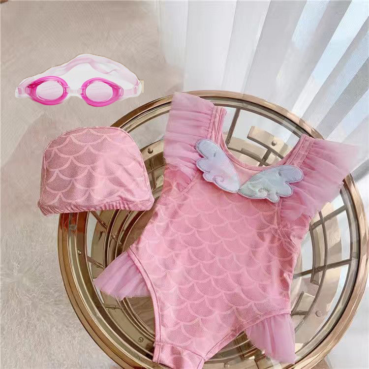 • 핑크 날개 원피스 수영복 + 수영 고글 + 수영 모자