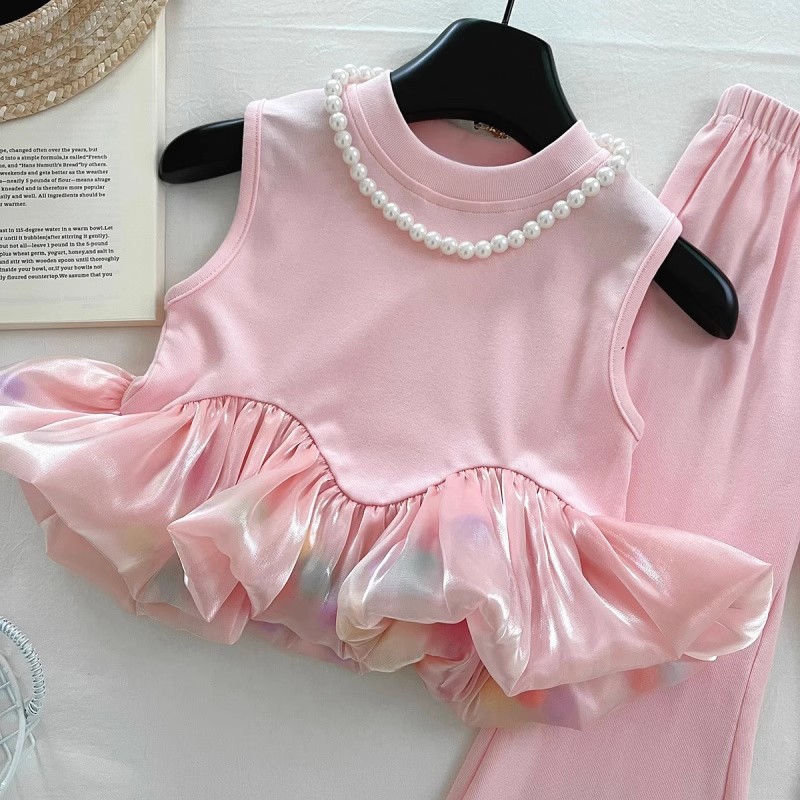 • 핑크색 상의와 바지 투피스 세트(목걸이 포함)