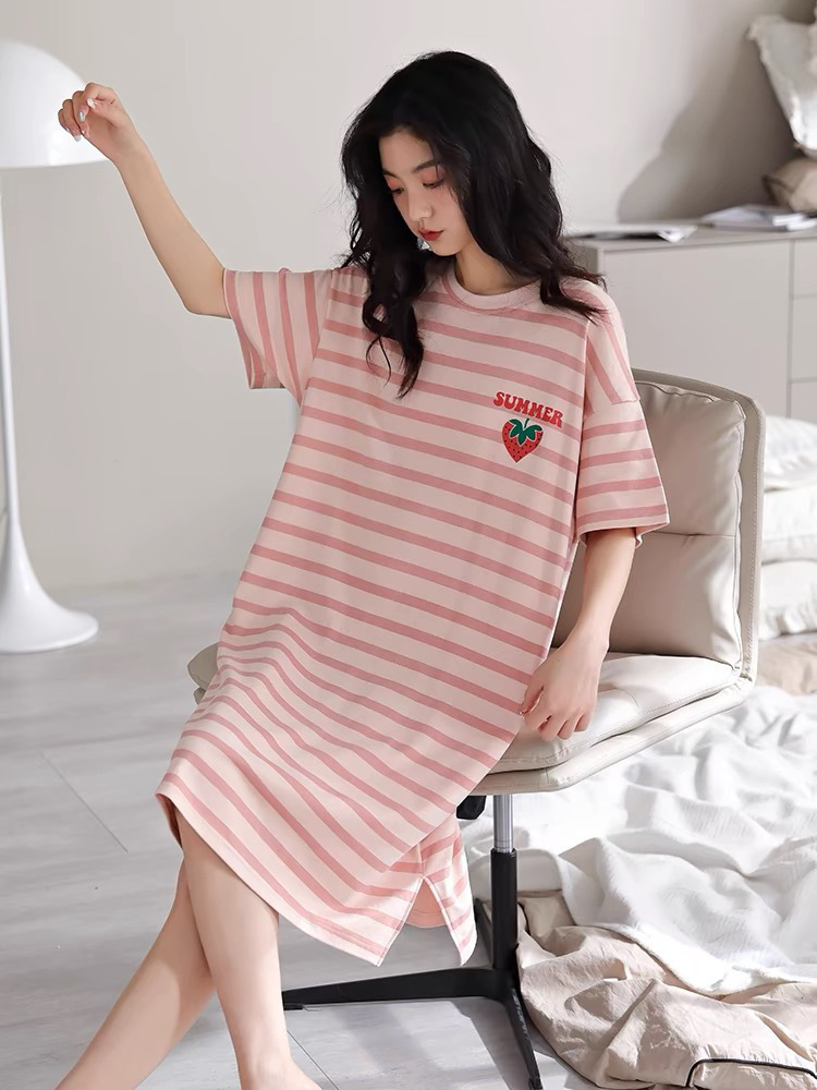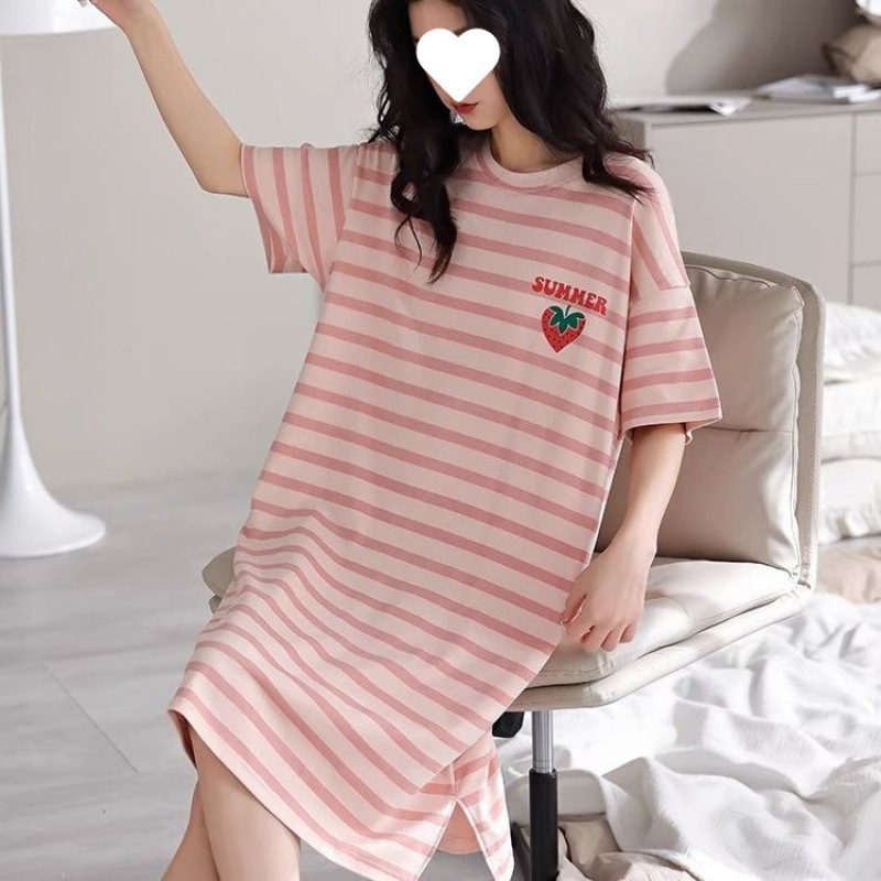 100% 면 잠옷 여성 여름 짧은 소매 중간 길이 원피스 귀여운 줄무늬 잠옷 2025 새 여름스토어 가기