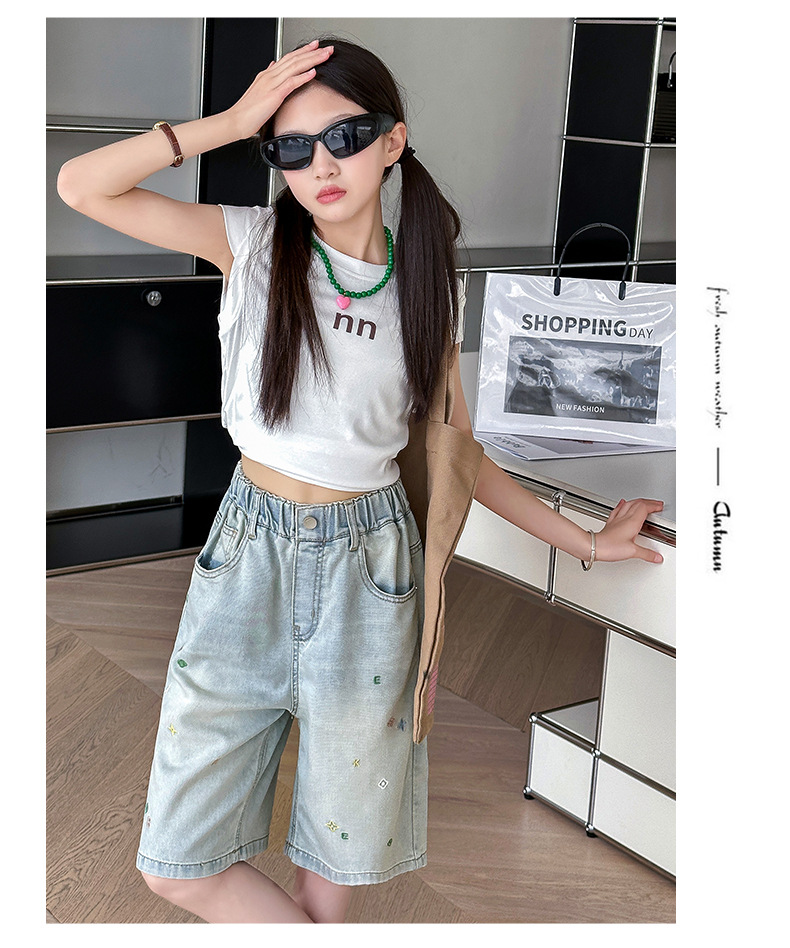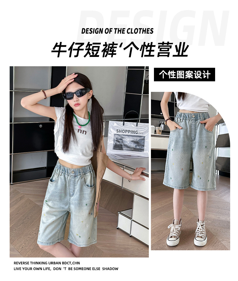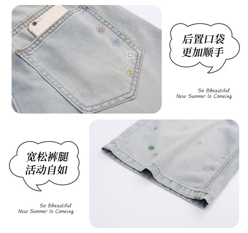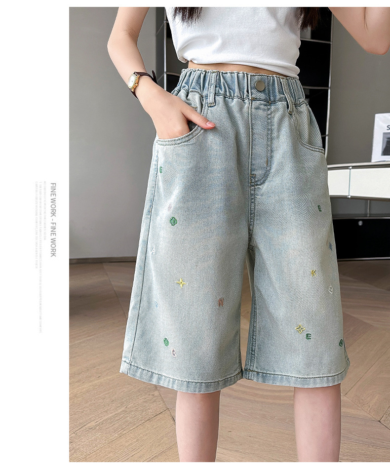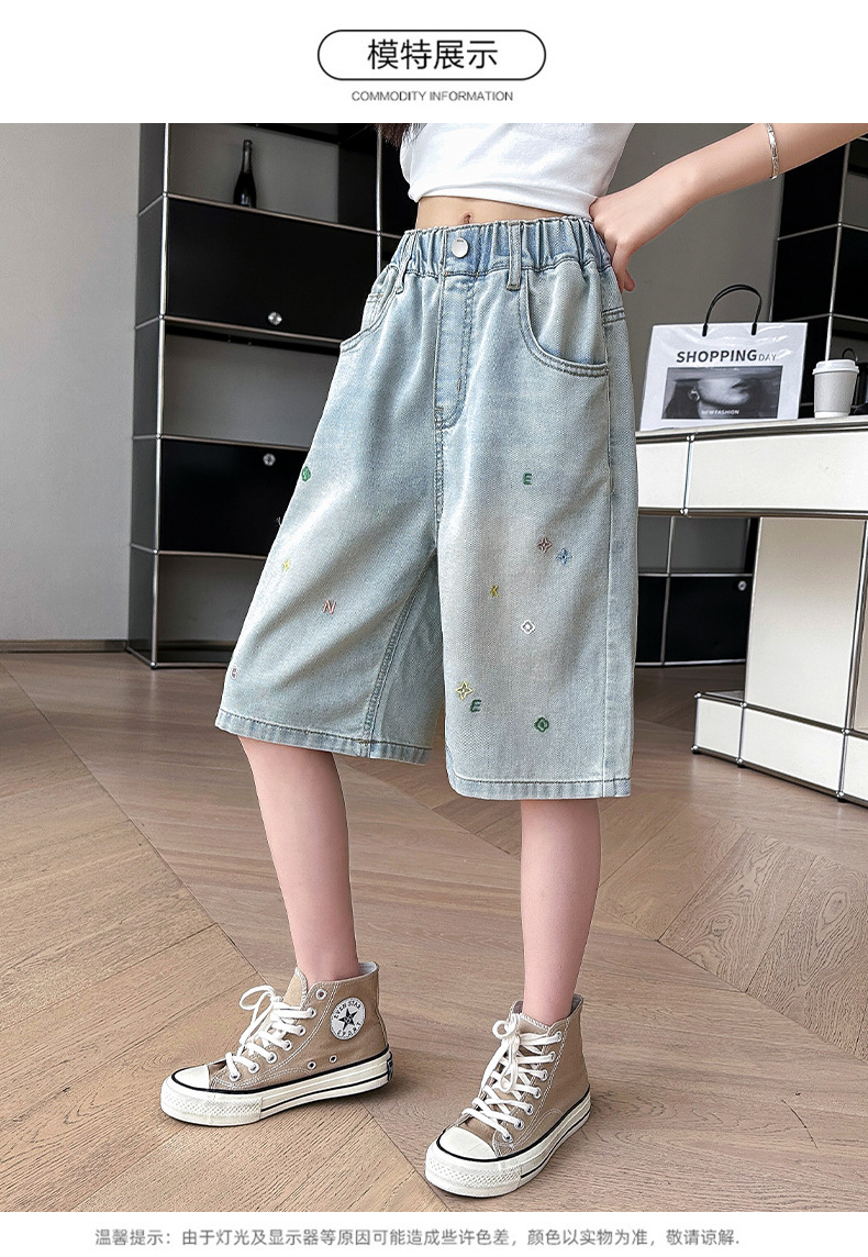 여아 패션 데님 반바지 여름 2025 새로운 아동 바지 중대형 아동 자수 꽃무늬 여름 5부 바지스토어 가기