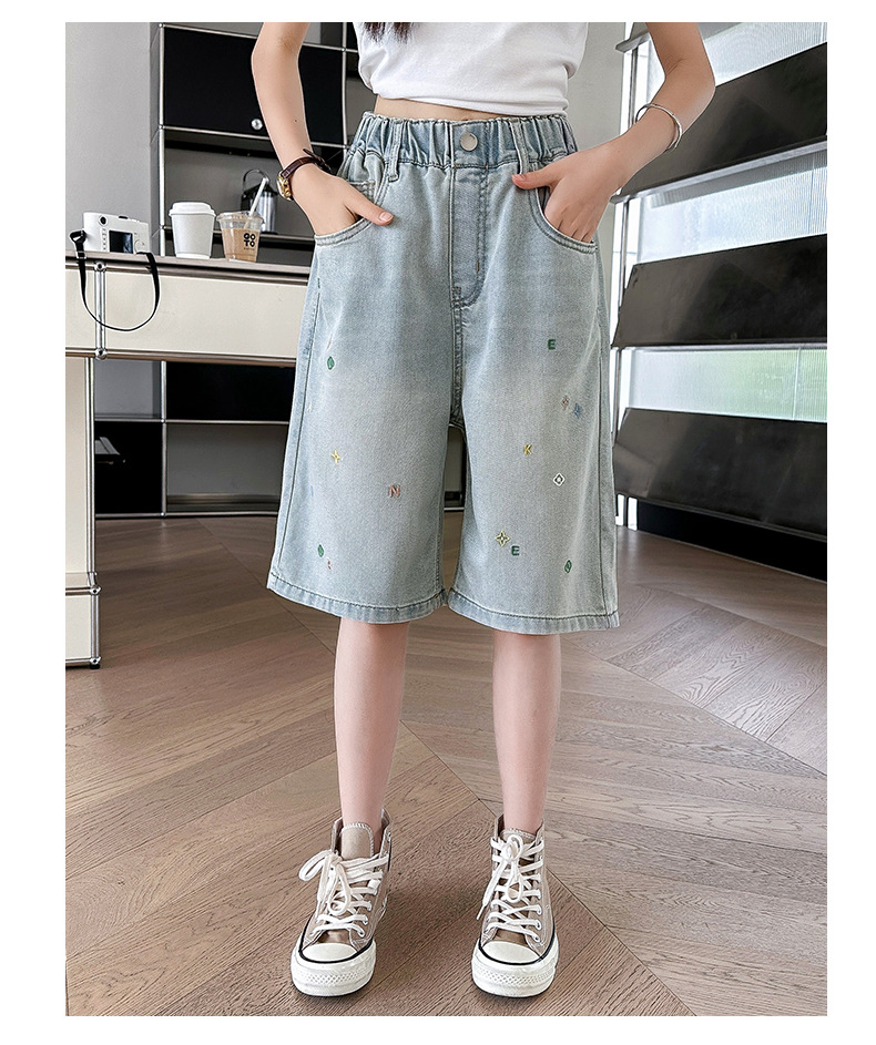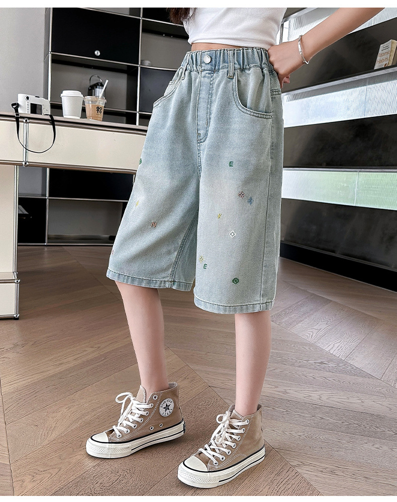 여아 패션 데님 반바지 여름 2025 새로운 아동 바지 중대형 아동 자수 꽃무늬 여름 5부 바지