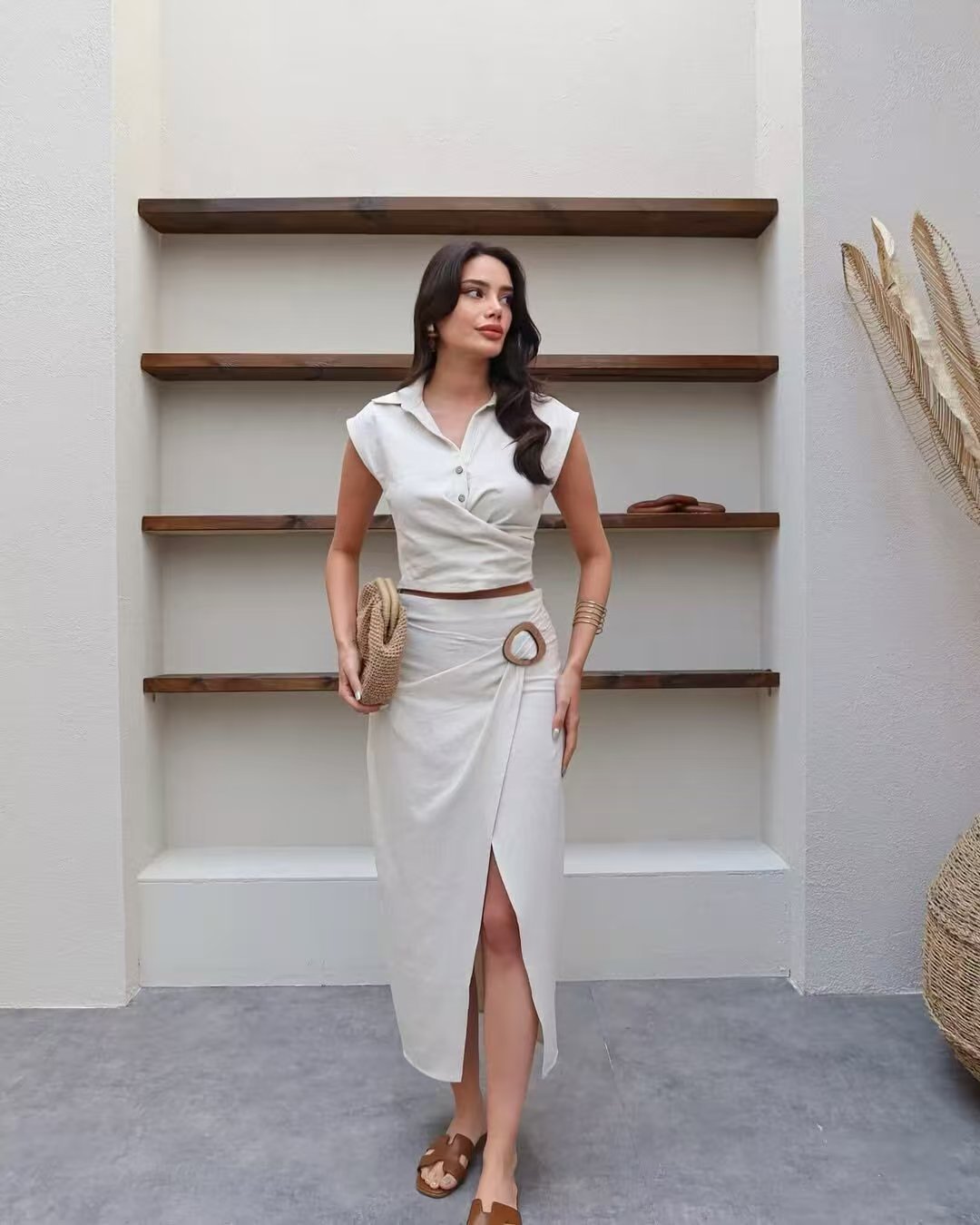 ZA 대외 무역 여성 2025 여름 새로운 패션 버클 디자인 린넨 짧은 최고 미디 원피스 세트