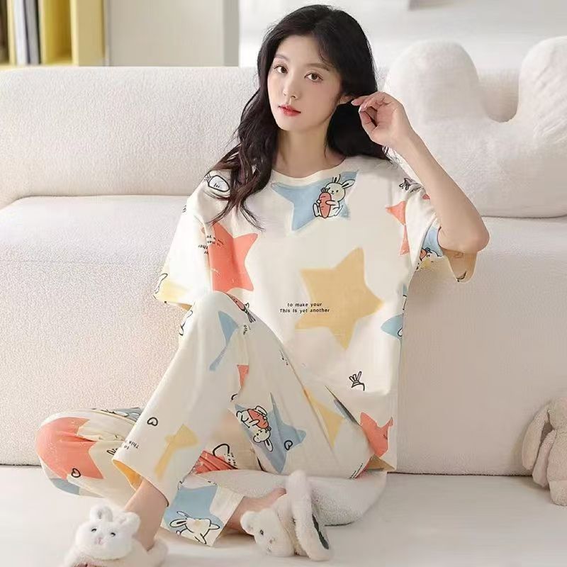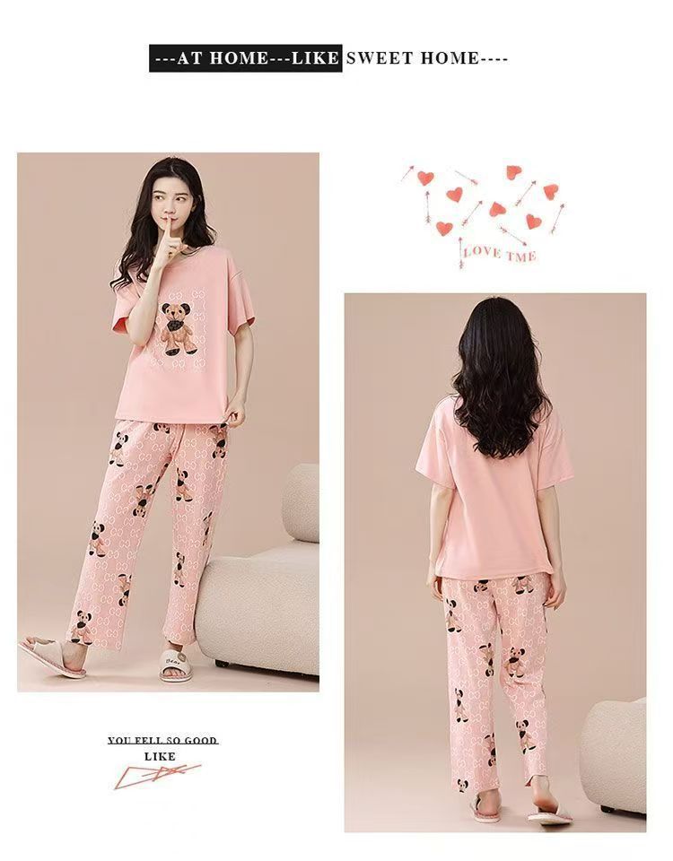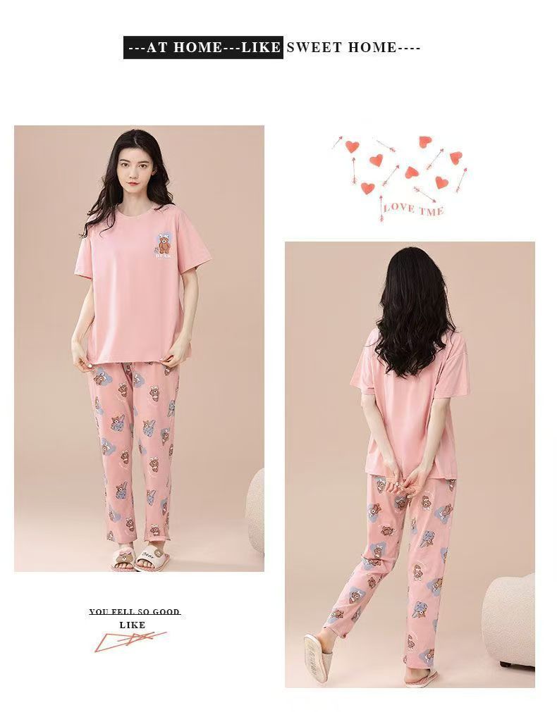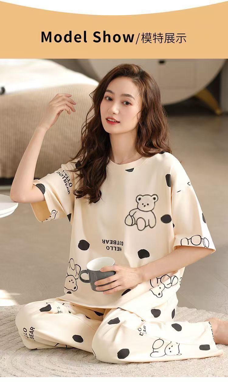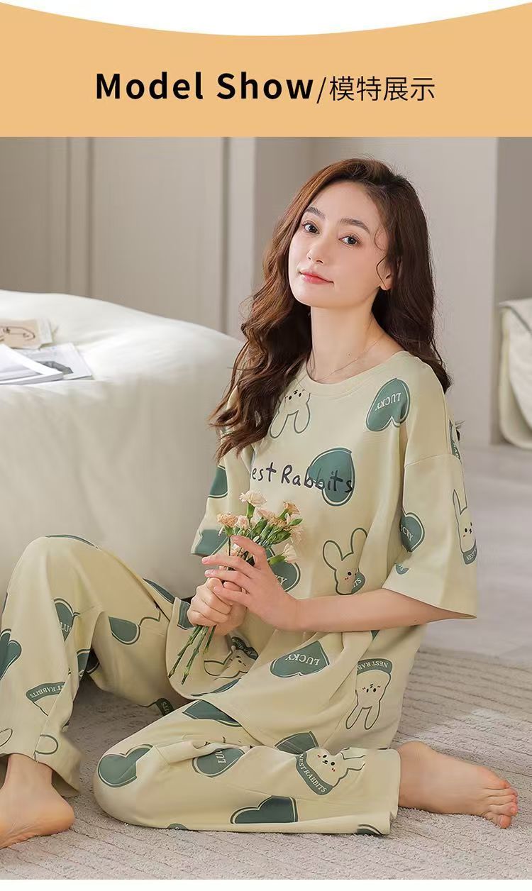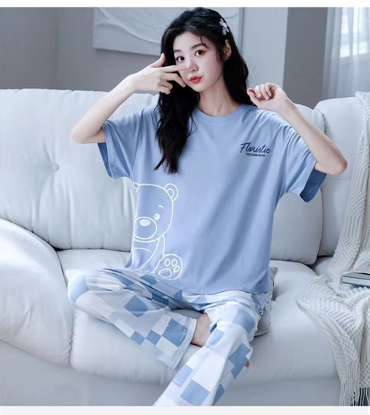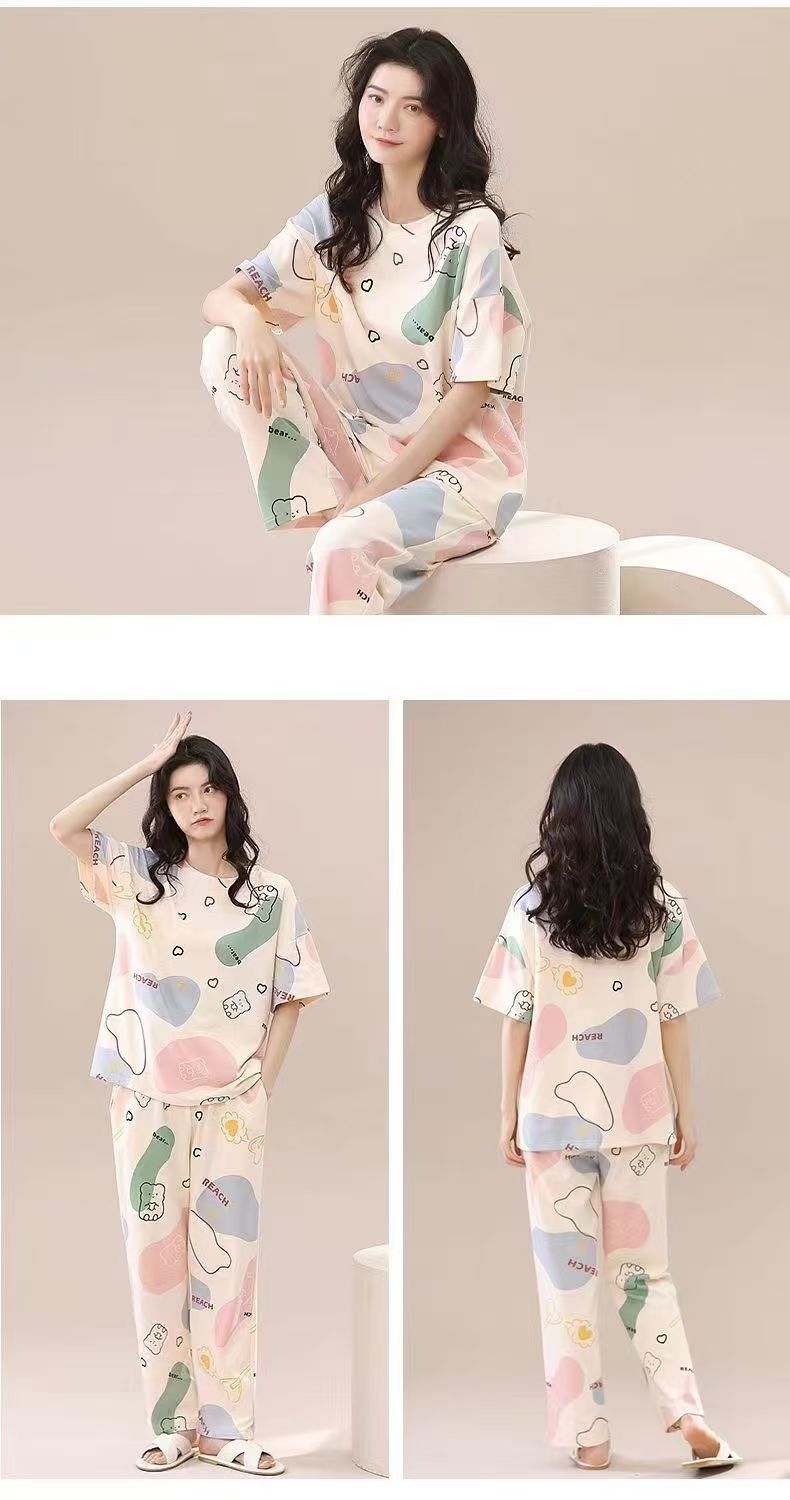 대외 무역 국경 파자마 여성의 새로운 여름 얇은 반팔 바지 라운드 넥 여름 겉옷 여성 세트스토어 가기