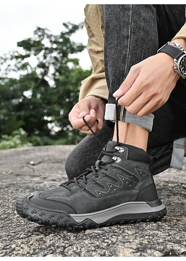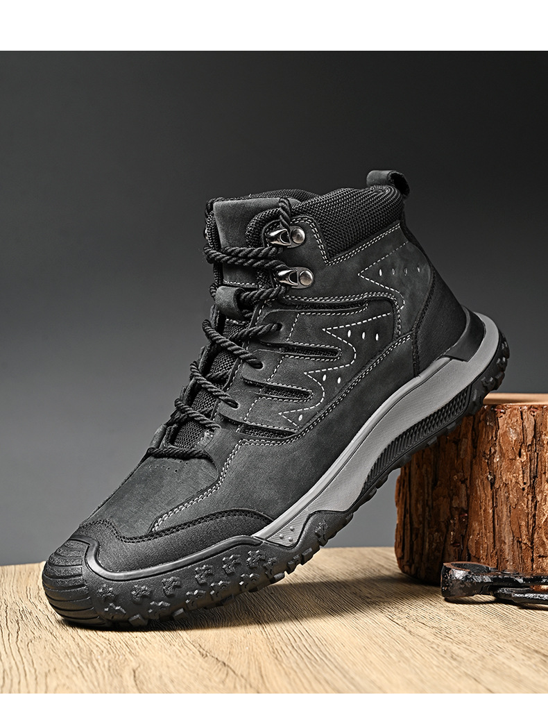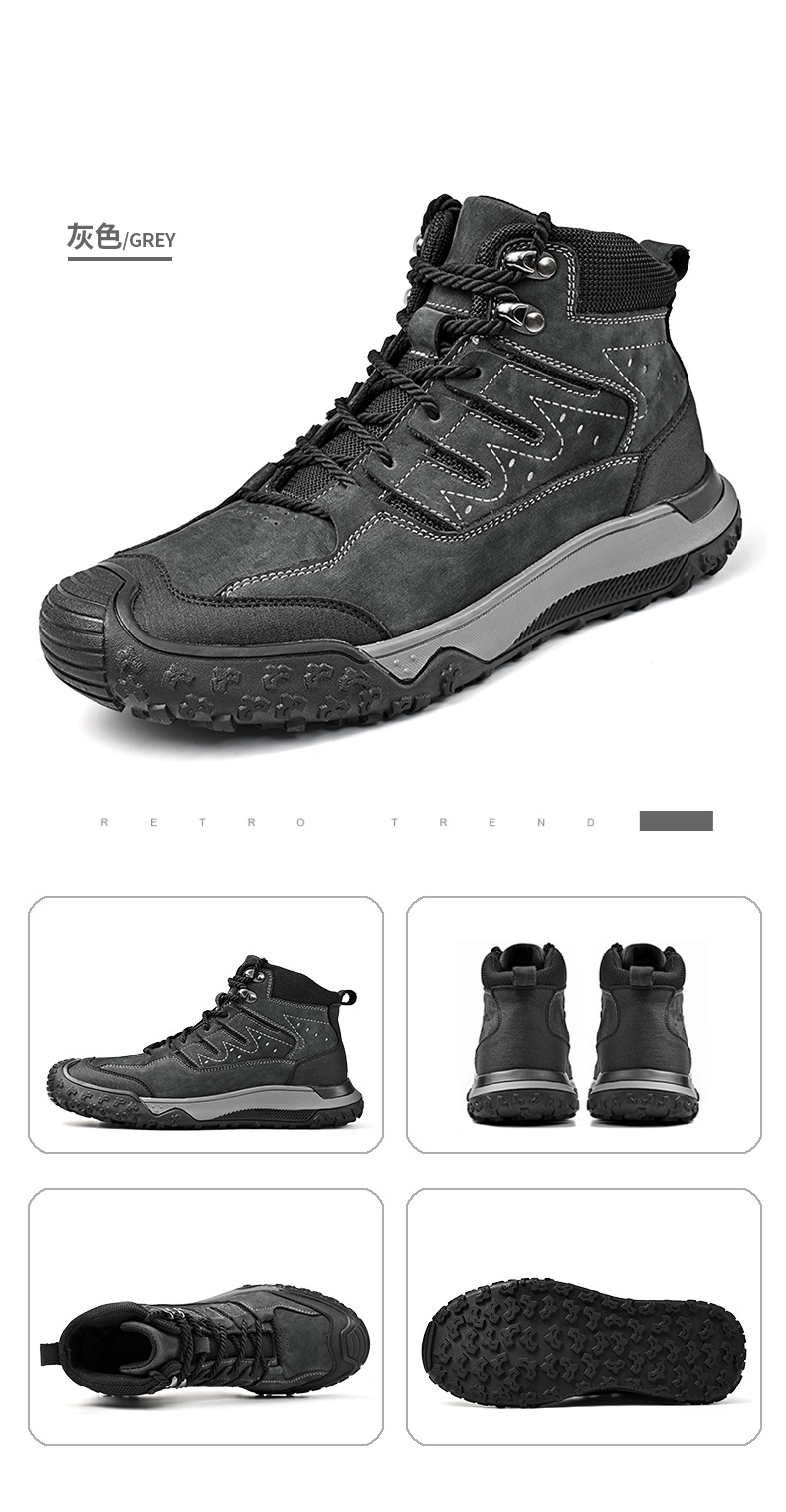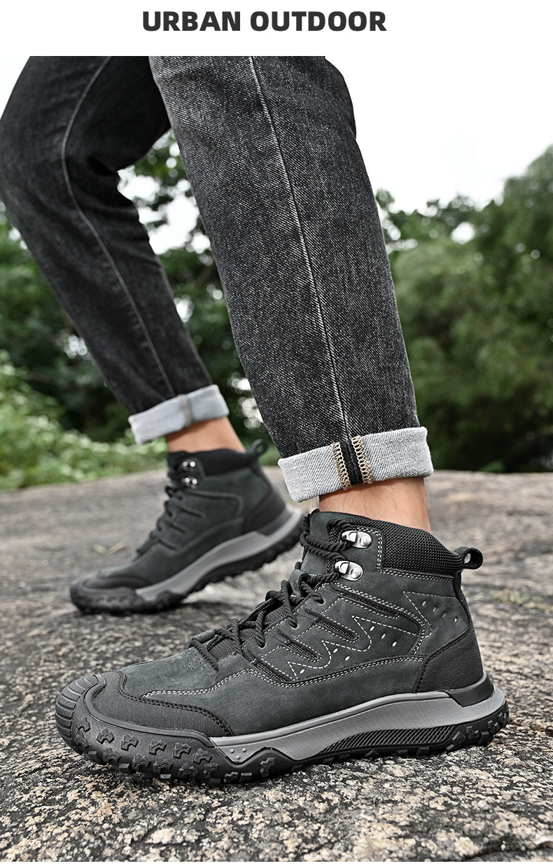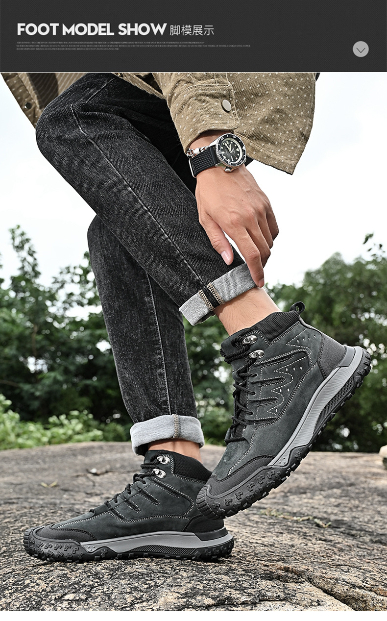 대외 무역 수출 남성용 야외 하이킹 신발, 하이탑 하이킹 신발, 가을 겨울 벨벳 코튼 남성용 신발, 1층 소가죽 레이스 업, 내마모성스토어 가기