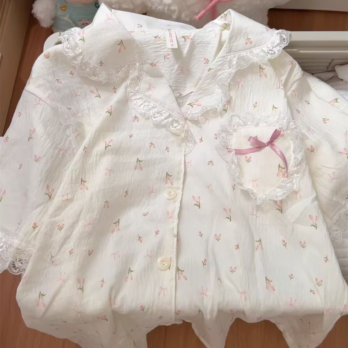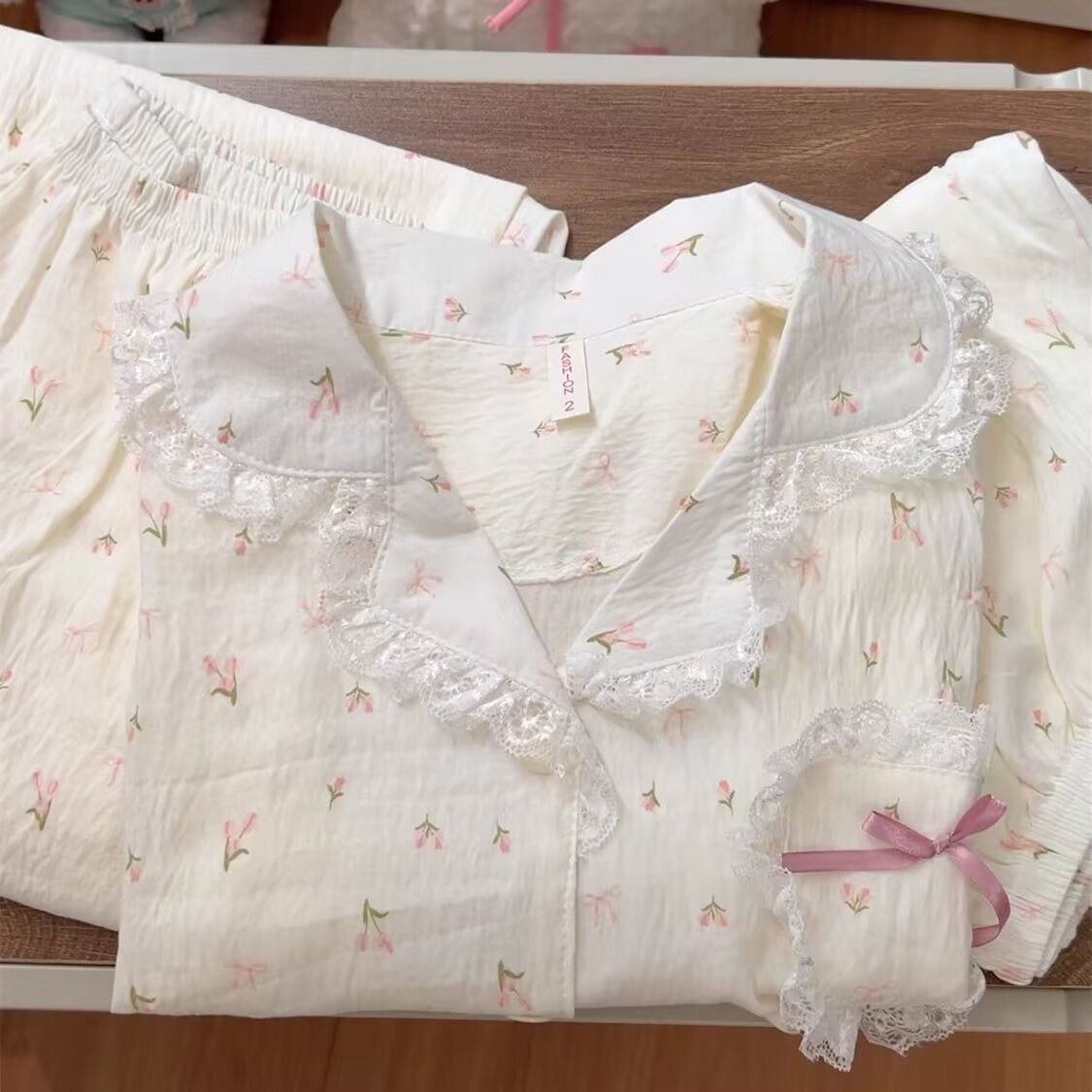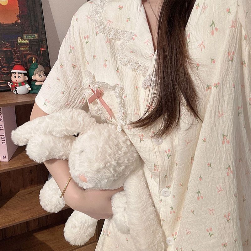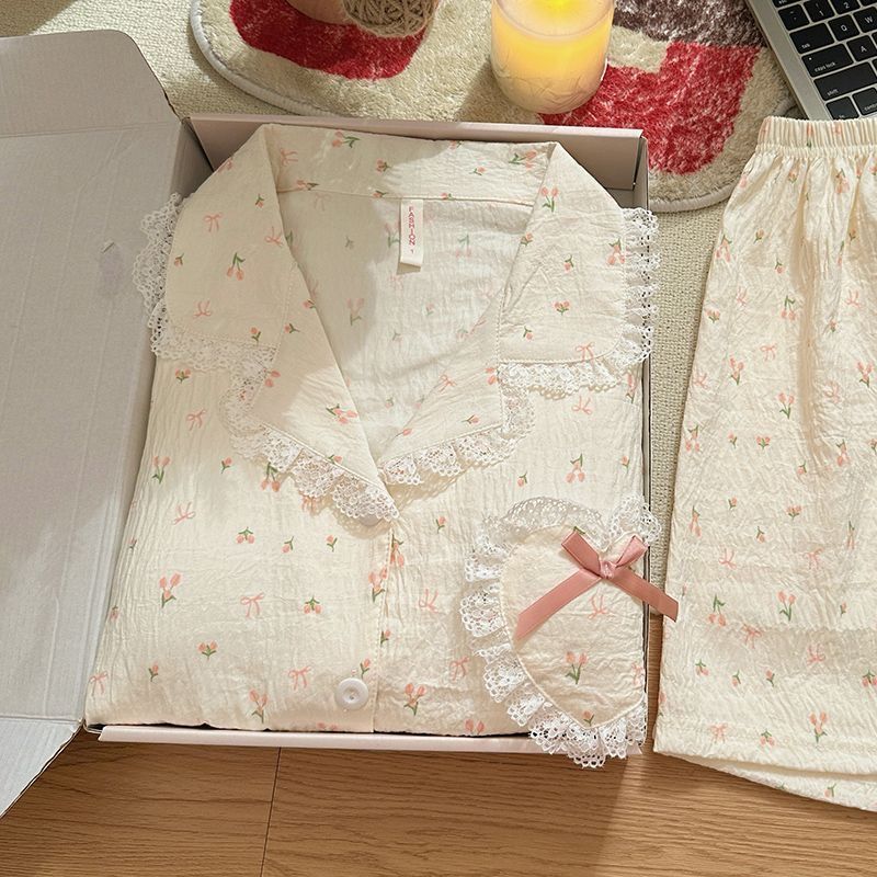 라이브 방송에서 인기 있는 튤립 프린트 레이스 여성용 여름 반팔 3피스 잠옷 세트, 구름같은 부드러운 면 소재로 나이를 잊게 하는 홈웨어스토어 가기