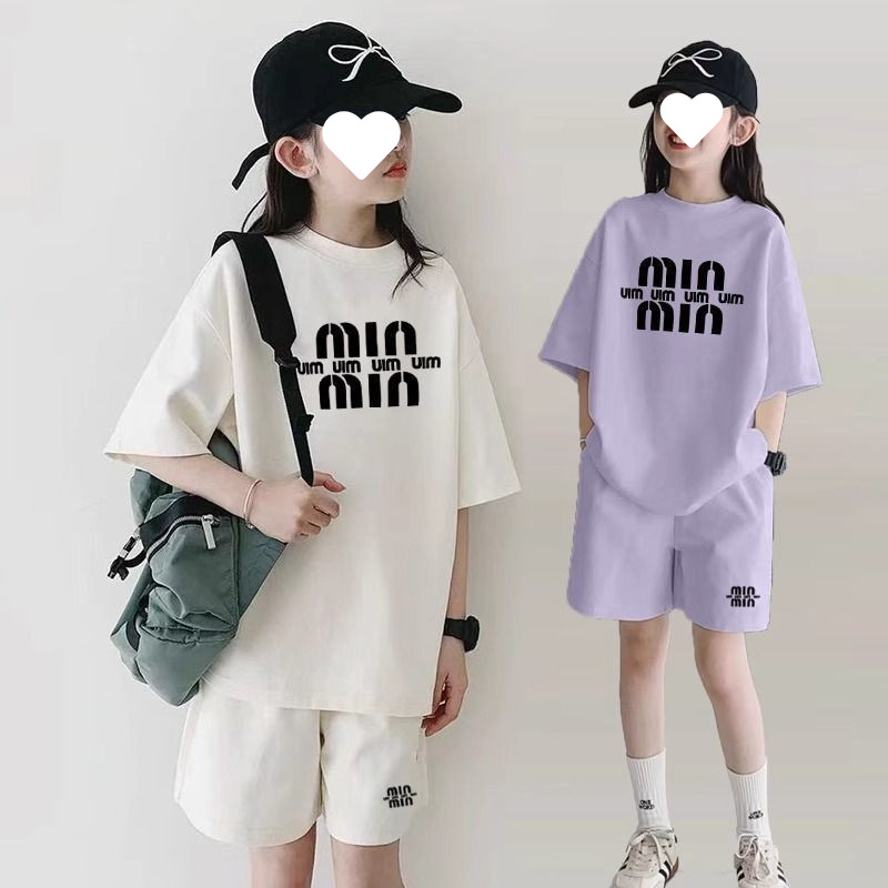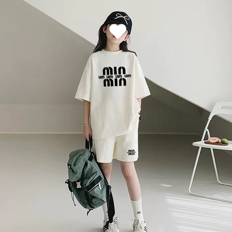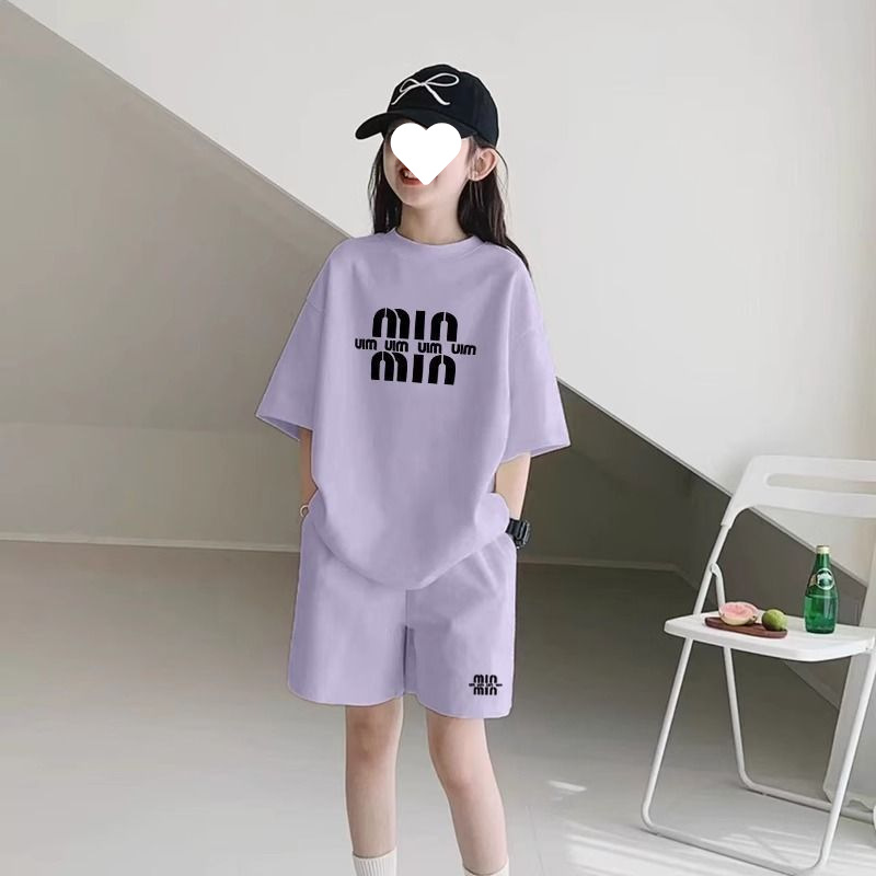 여자 큰 어린이 얇은 티셔츠 반바지 투피스 2025 새로운 서양식 단색 탑 바지 세트 패션스토어 가기