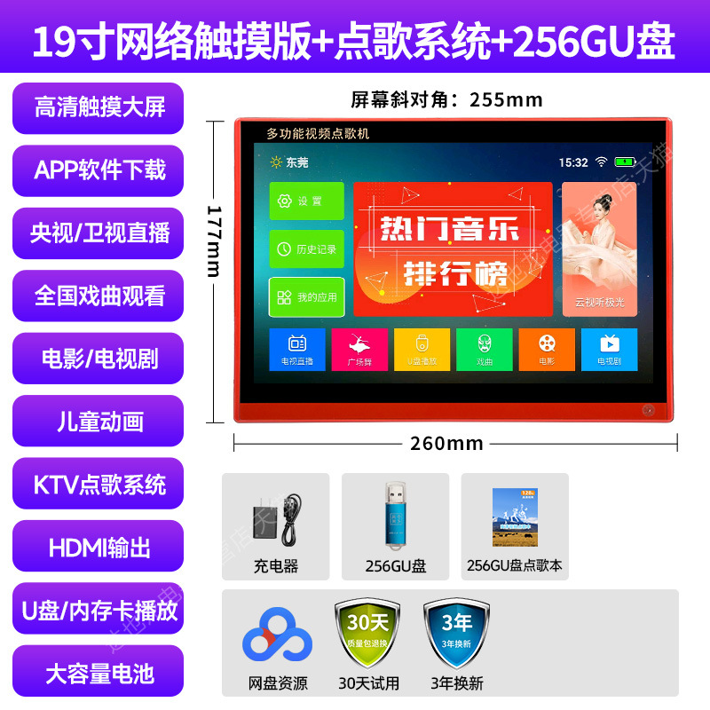 • 19inch 네트워크 터치스크린 버전 + 노래방 시스템 + [2,000개 이상의 TV 방송국] + 256GU 디스크