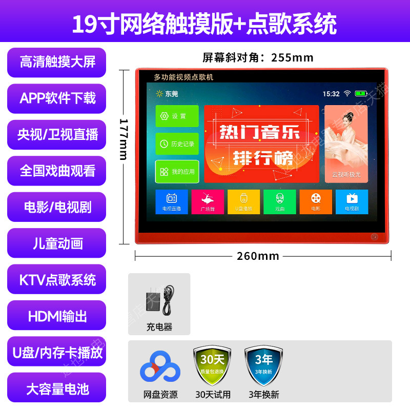 • 19inch 네트워크 터치스크린 버전 + 노래방 시스템 + [2,000개 이상의 TV 방송국] + 1126개 파일 내장 64GU 디스크