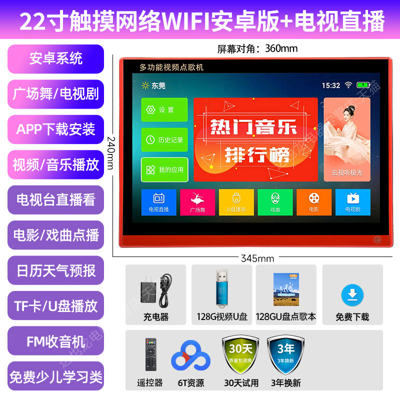 • 22inch 네트워크 터치스크린 버전 + 노래방 시스템 + HD 라인 + [2,000개 이상의 TV 방송국] + 2807개 파일 내장 128GU 디스크