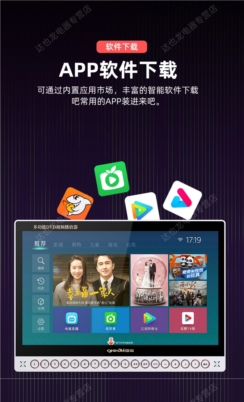 • 19inch 네트워크 터치스크린 버전 + 노래방 시스템 + [2,000개 이상의 TV 방송국] + 1003개 파일 내장 32GU 디스크