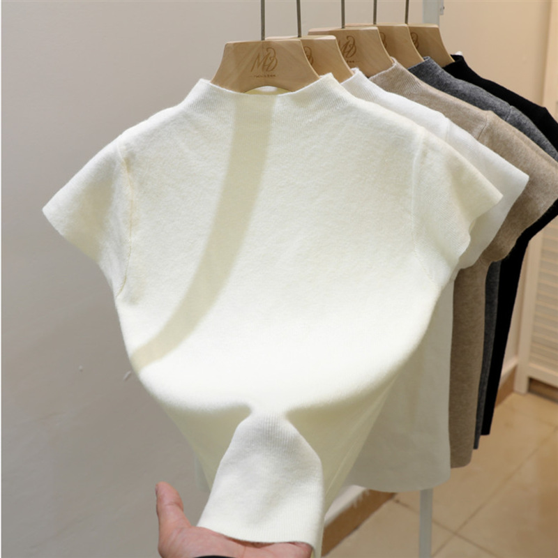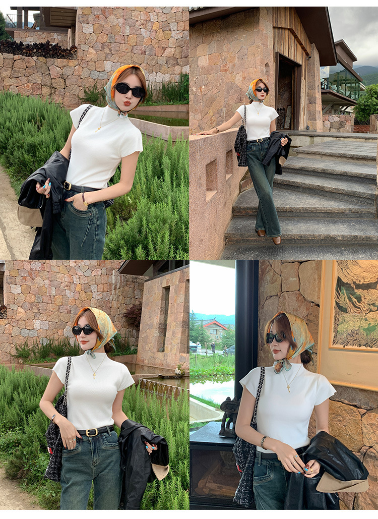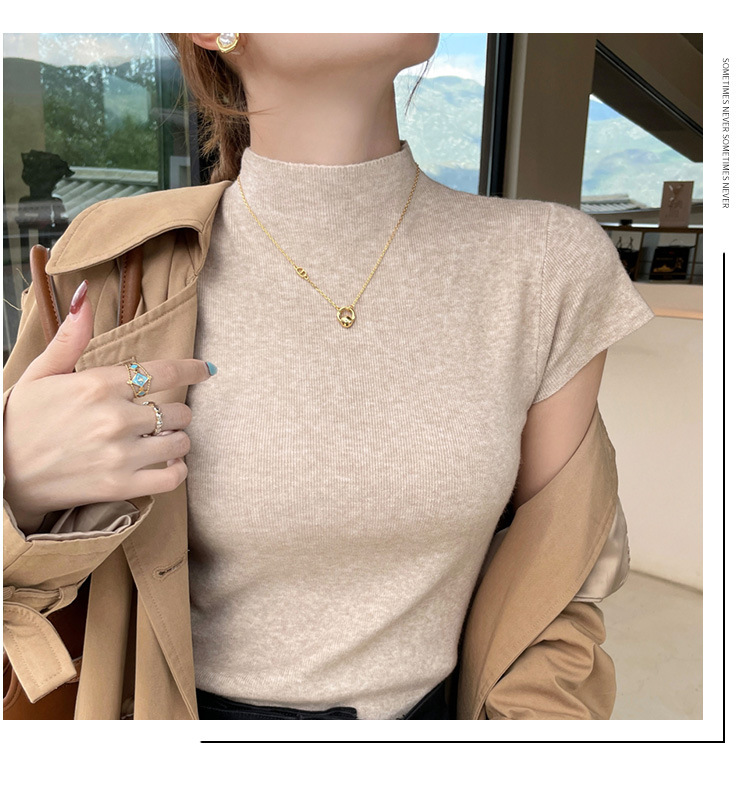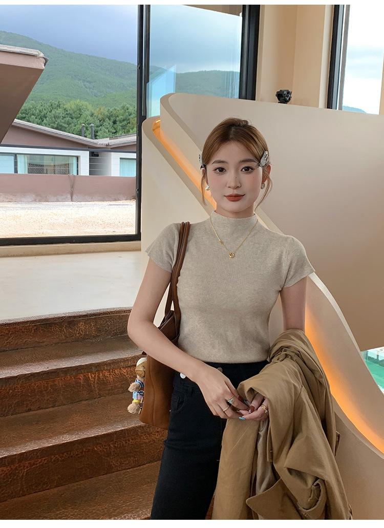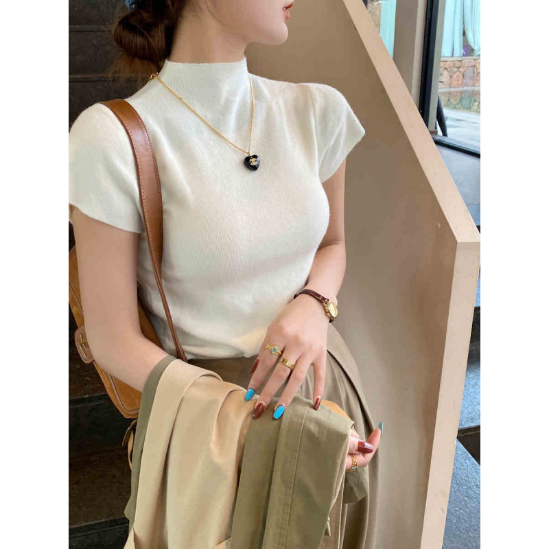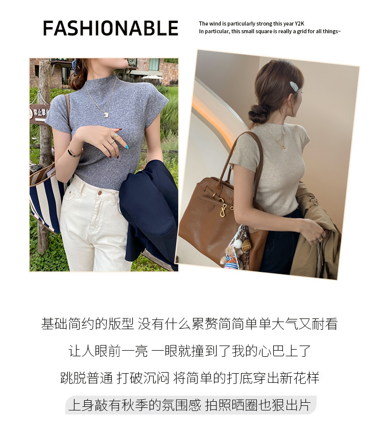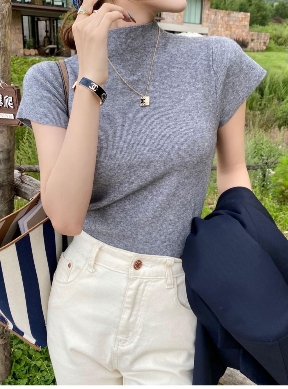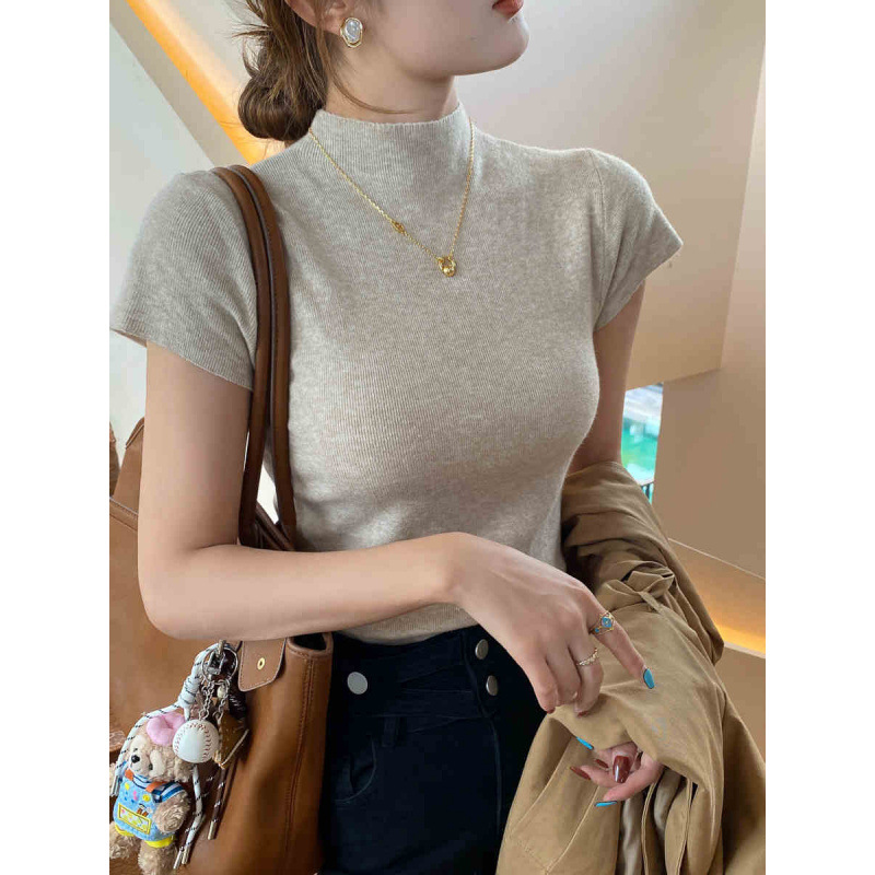그레이 하프 하이 넥 반팔 티셔츠 여성용 2025 년 여름 새로운 슬림 핏 하이 엔드 니티드베이스 탑스토어 가기