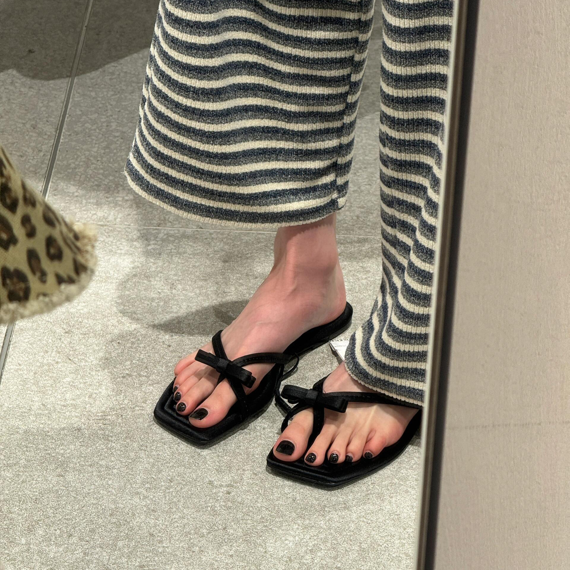 양가죽 버전 ~ 여성용 정품 가죽 보우 플랫 플립플롭 여름 프렌치 슬리퍼 아우터웨어 소프트솔 하프 슬리퍼 하프 슬리퍼