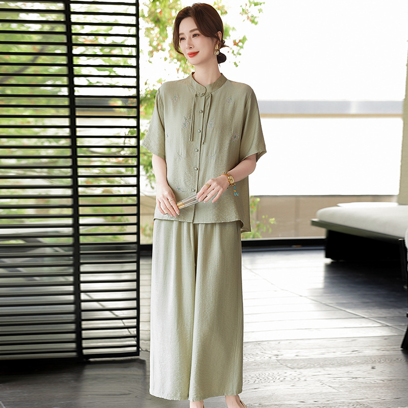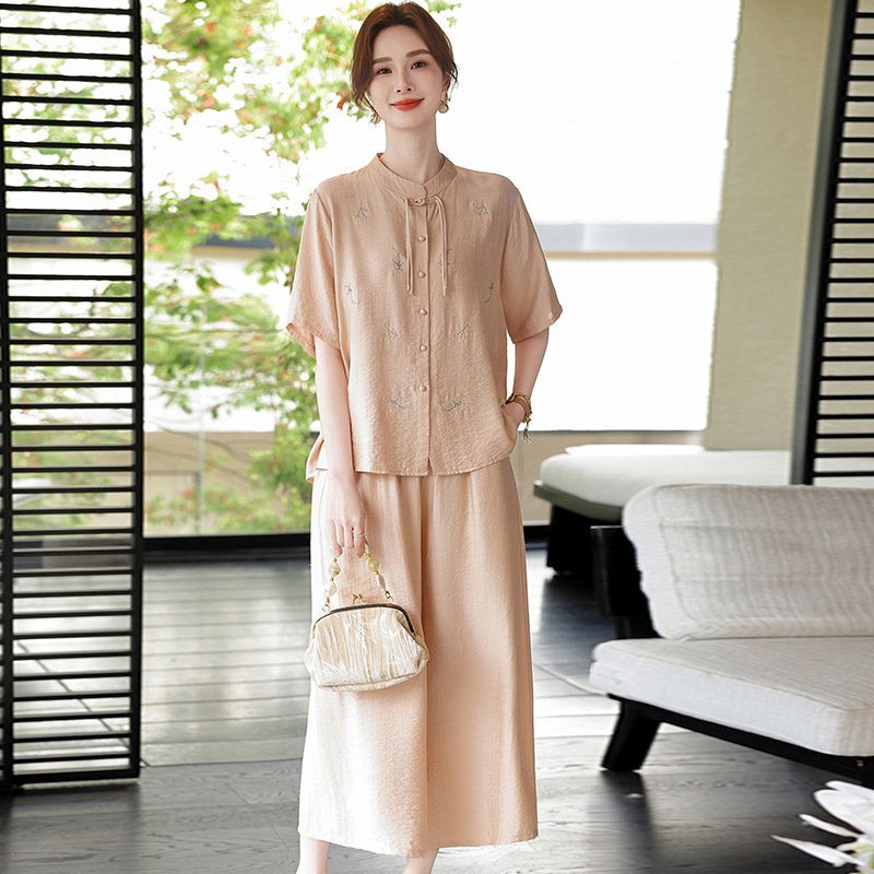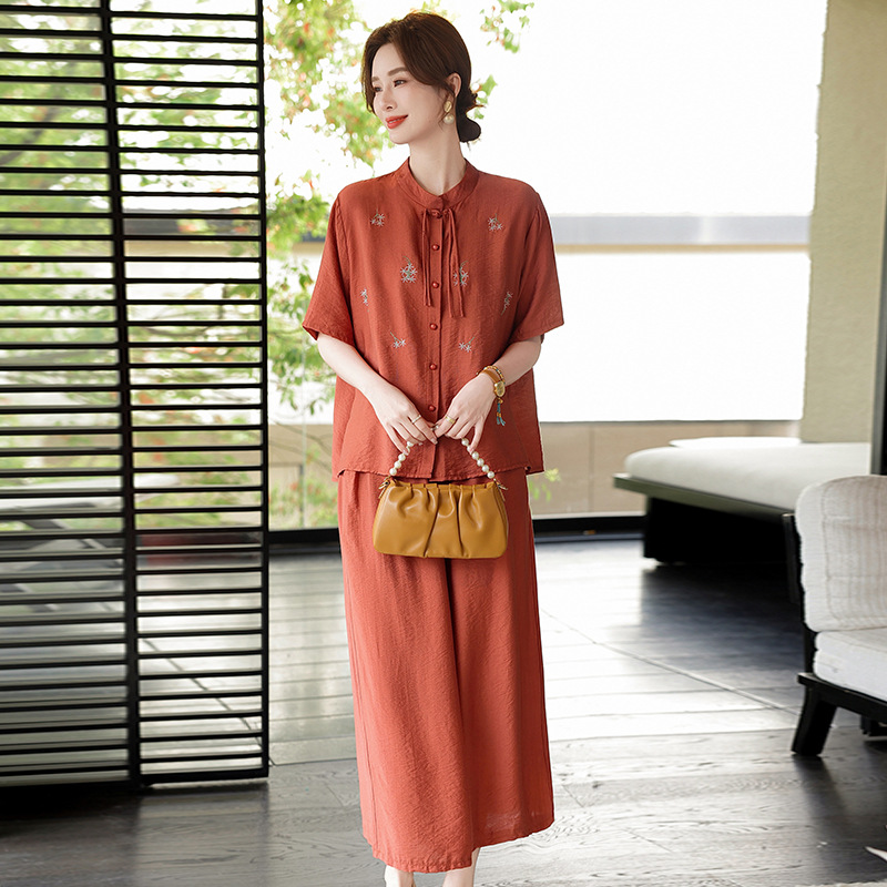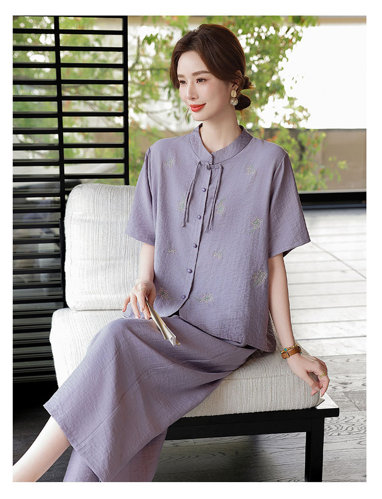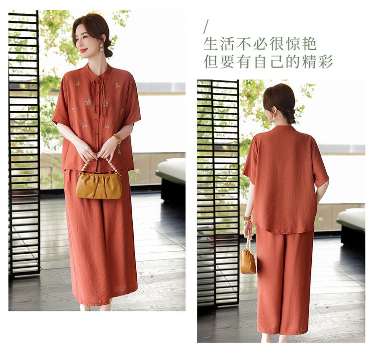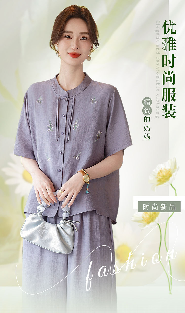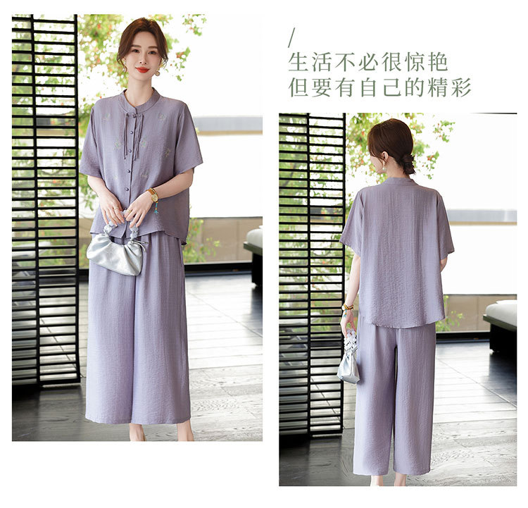 어머니 여름 국가 스타일 서양식 투피스 세트 2025 새로운 중년 및 노인 여성 면 린넨 느슨한 슬리밍 플러스 사이즈 세트