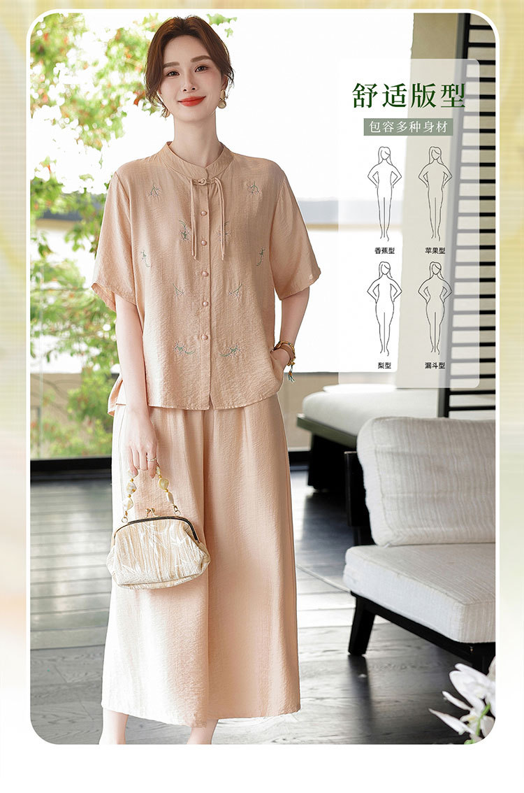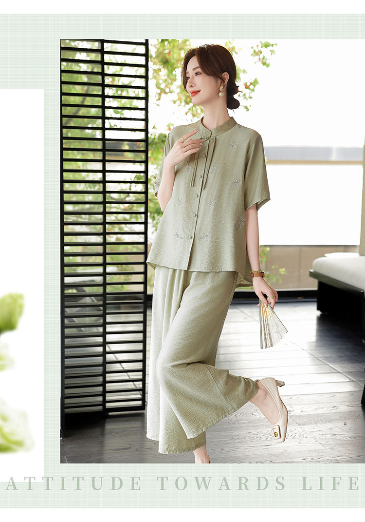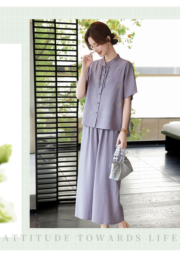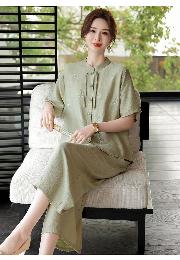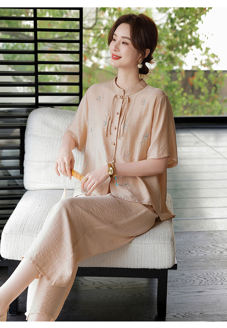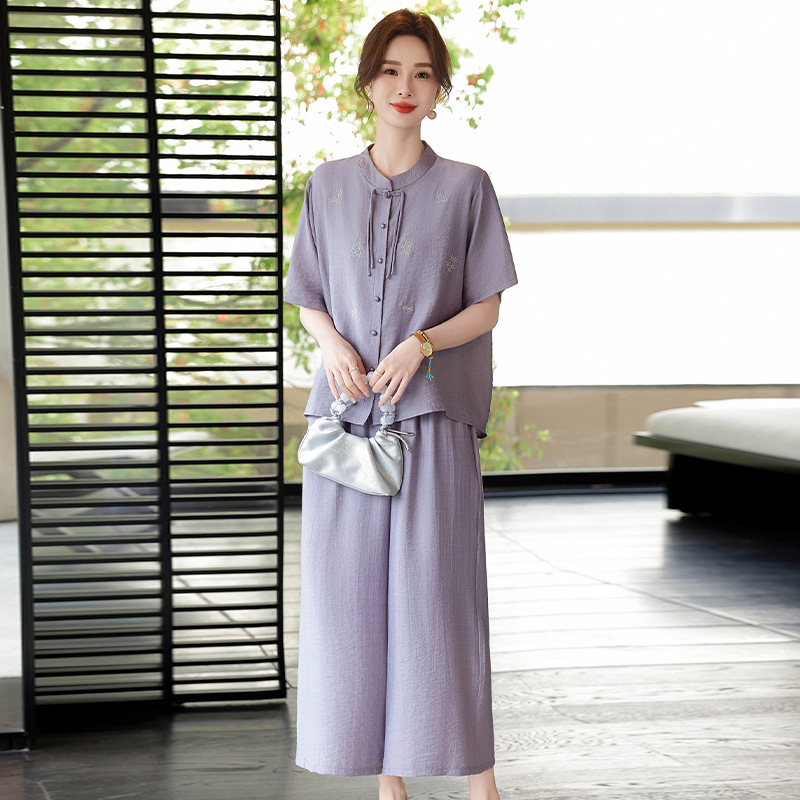 어머니 여름 국가 스타일 서양식 투피스 세트 2025 새로운 중년 및 노인 여성 면 린넨 느슨한 슬리밍 플러스 사이즈 세트