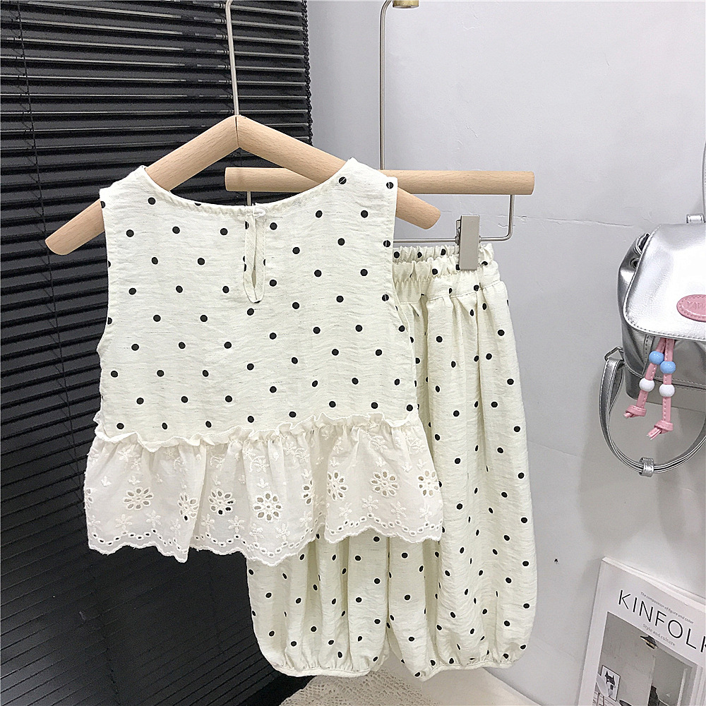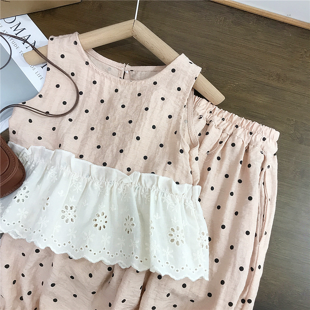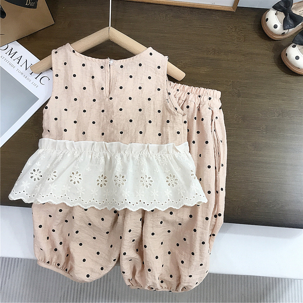 여자 아동복 여름 새로운 여성의 보물 패션 폴로 도트 레이스 민소매 조끼 최고 세련된 바지 세트 대외 무역스토어 가기